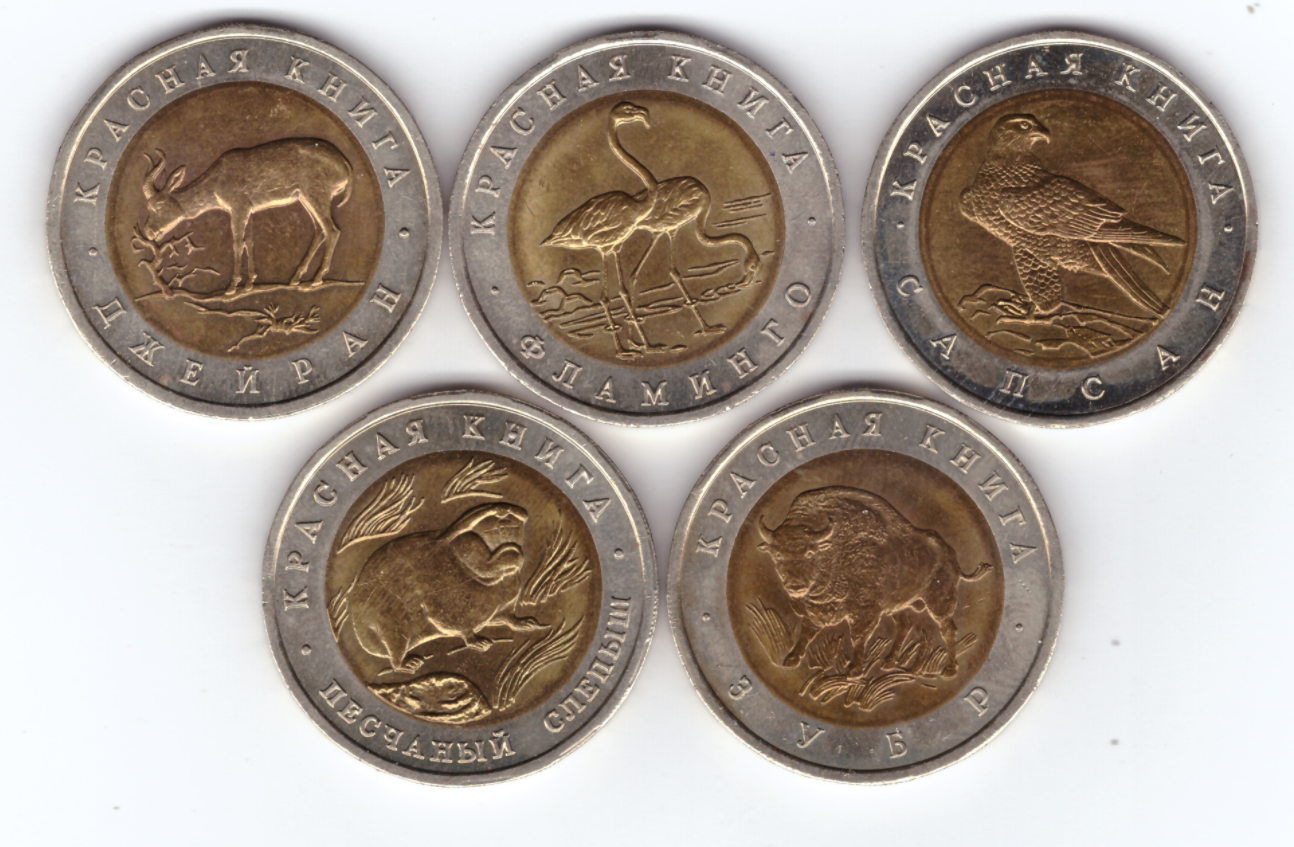 Монеты серии "Красная книга" 1994 год (сапсан, фламинго, джейран, зубр, слепыш)