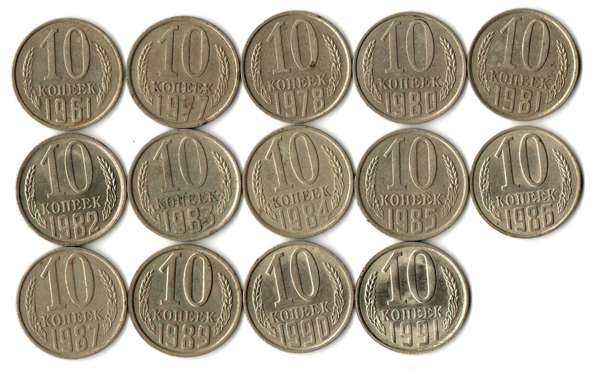 Набор 10 копеек СССР (14 монет) 1961, 77, 78, 80-87, 89-91Л. VF-XF