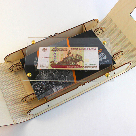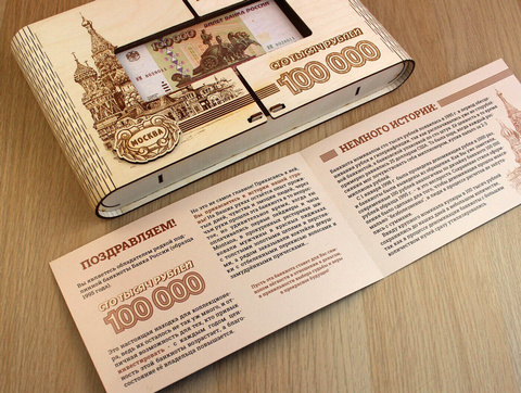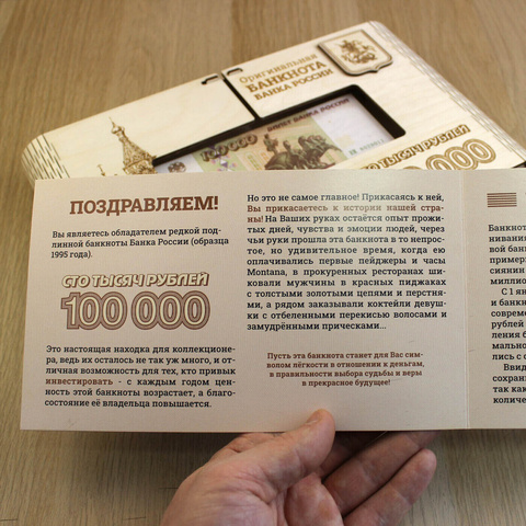 Банкнота оформлена в стильную подарочную упаковку из фанеры, украшенной гравировкой и снабжена красивой информационной открыткой.