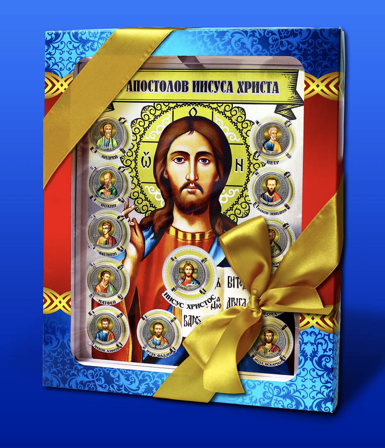 Набор «12 Апостолов + Иисус Христос» цветные гравированные монеты в планшете с коробкой.