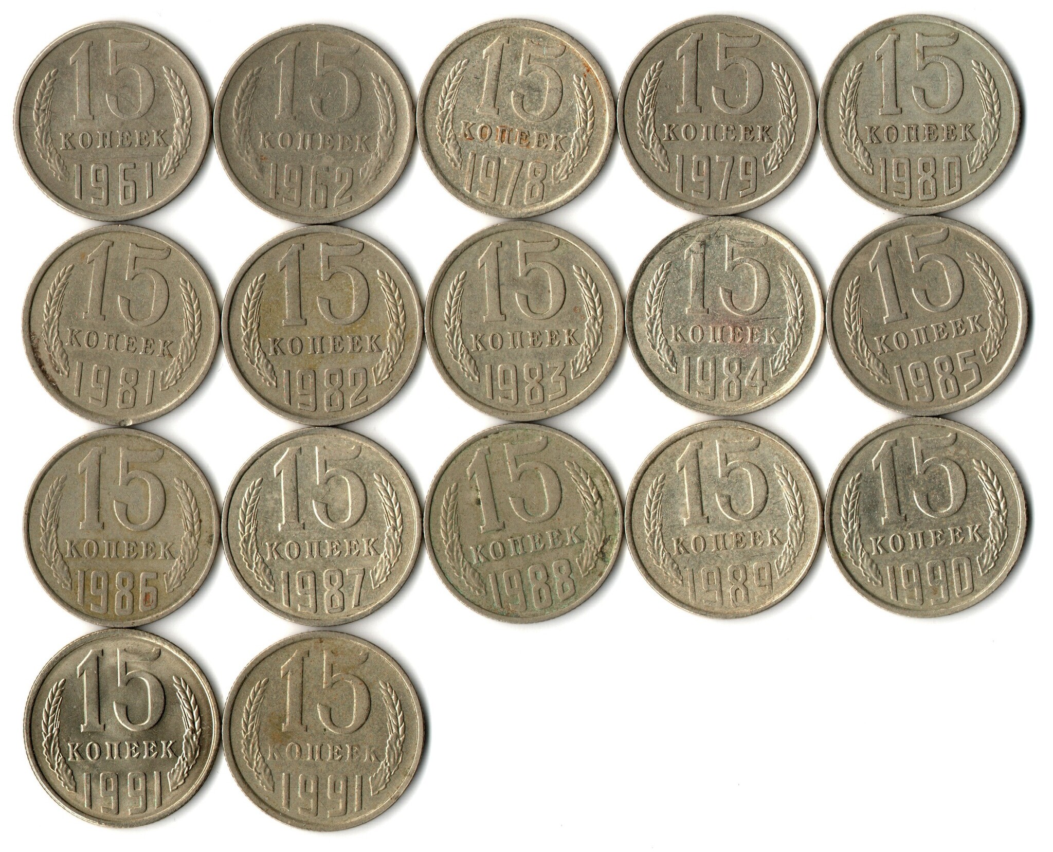 Набор 15 копеек СССР (17 монет) 1961,62, 78-91м/л. VF-XF