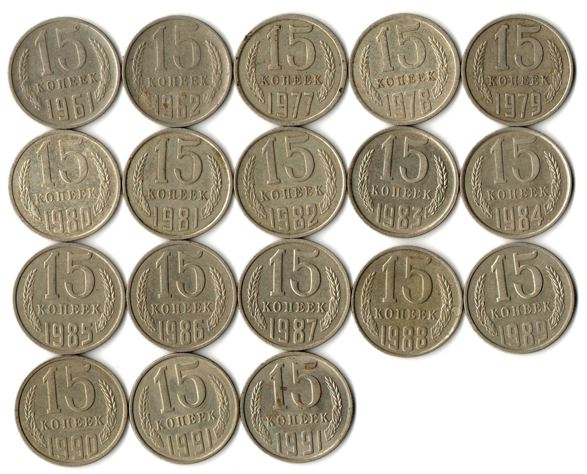 Набор 15 копеек СССР (18 монет) 1961,62, 77-91м/л. VF-XF