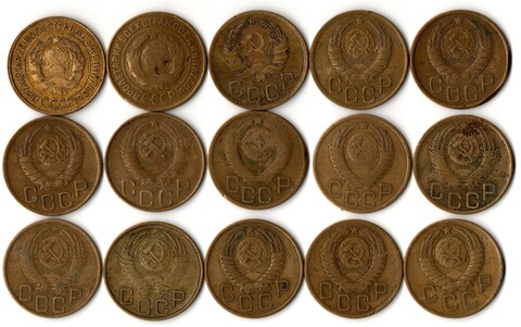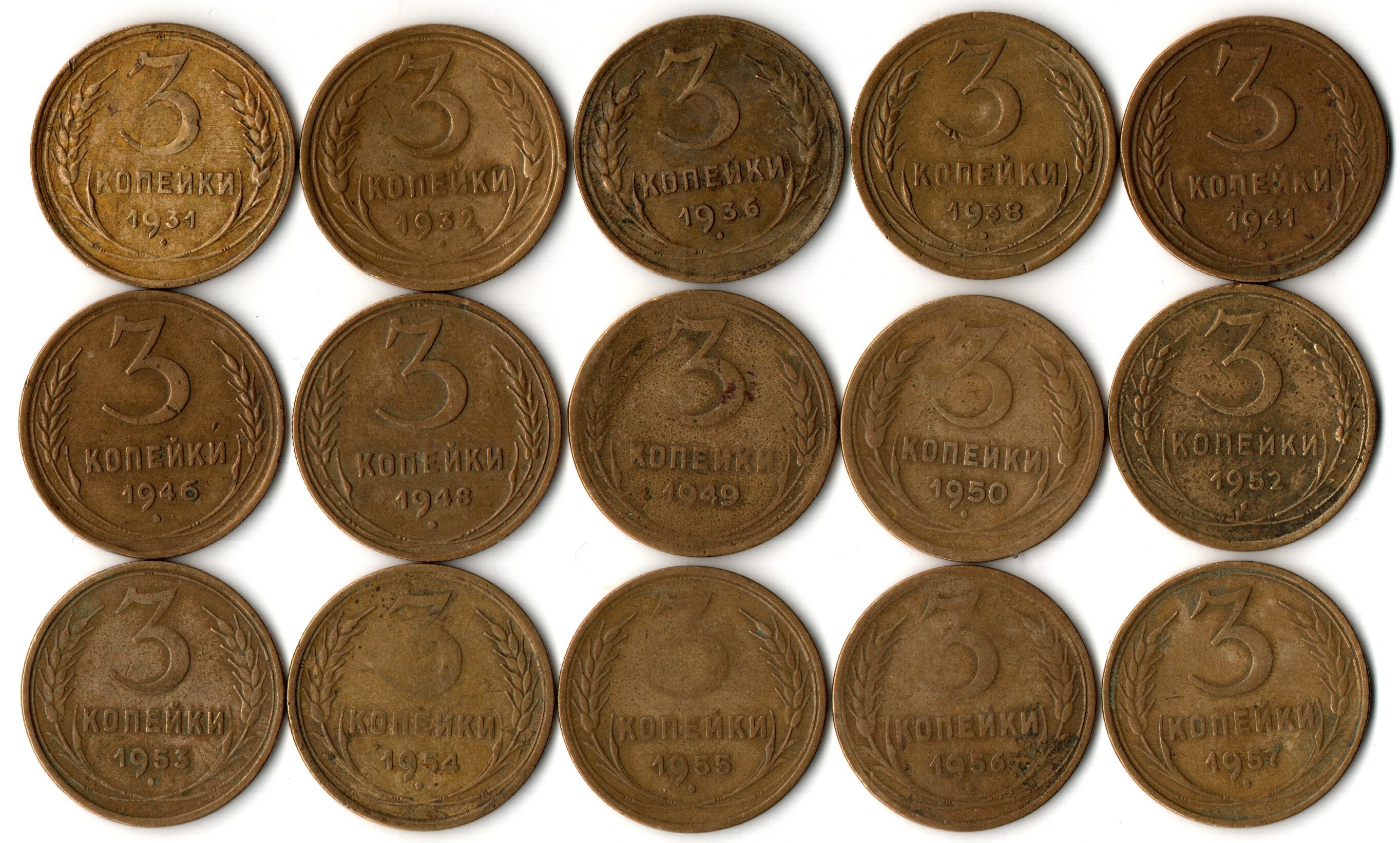 Набор 15 монет 3 копейки ранний СССР 1931, 32, 36, 38, 41, 46, 48, 49, 50, 52, 53, 54, 55, 56, 57 гг.
