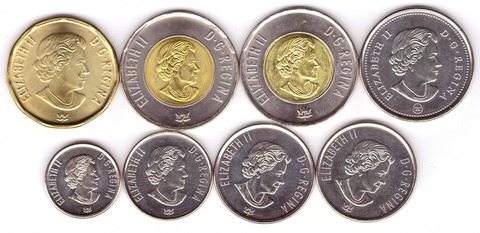 Набор из 8 монет (5 центов, 10 центов, 25 центов, 50 центов, 1 доллар, 2 доллара, 25 центов и 2 доллара с цветным изображением)