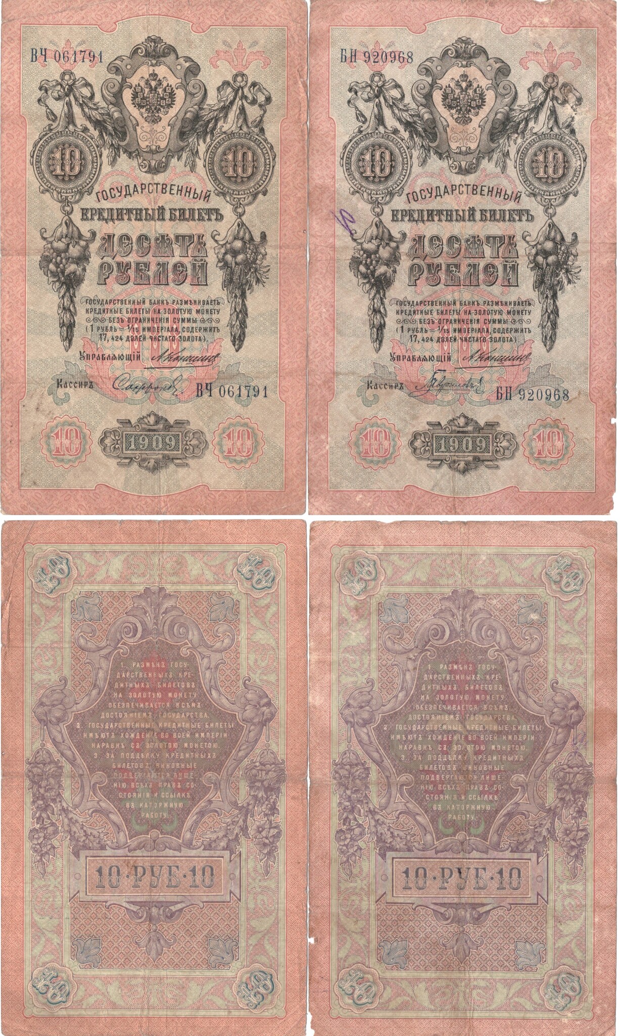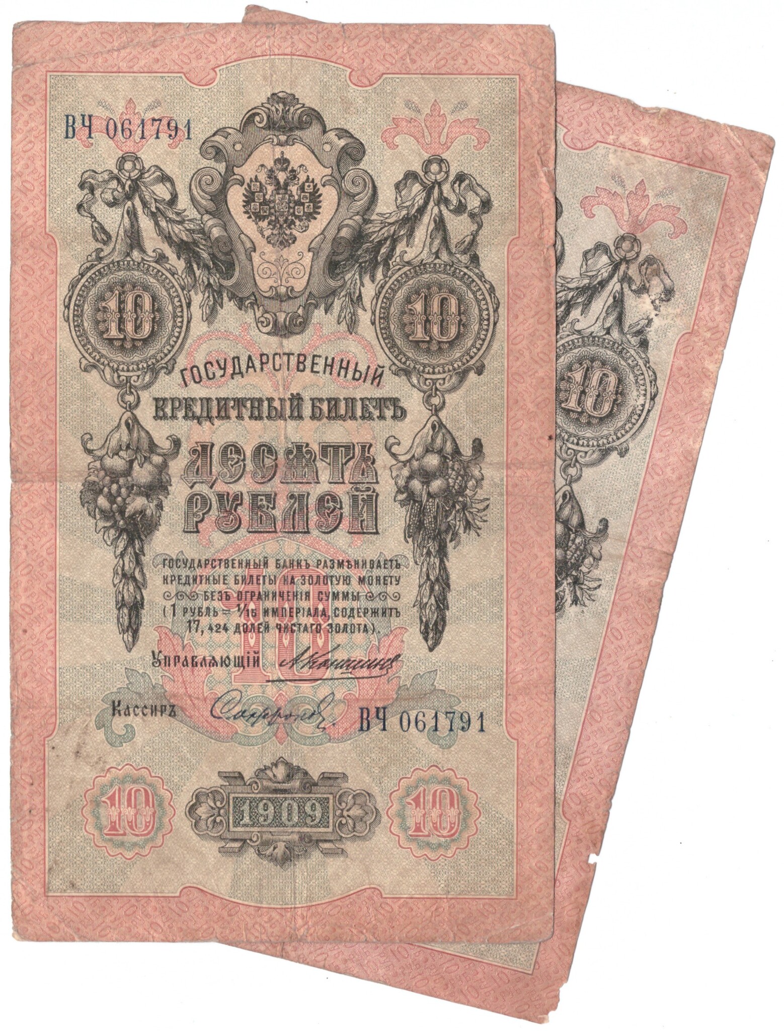 Набор 2 банкноты Управляющий Коншин кассиры Гаврилов и Сафронов Кредитные билеты 10 рублей 1909 года VF-