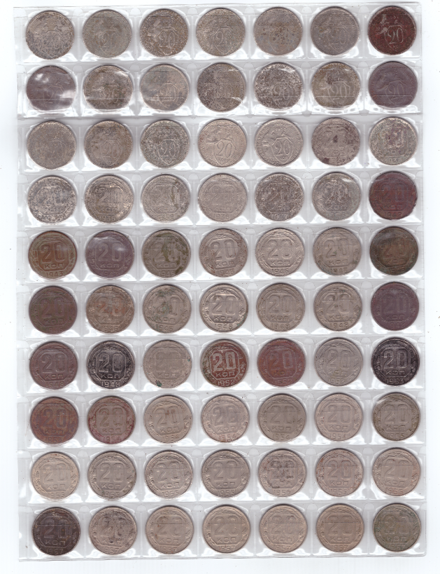 Набор 20 копеек (70 штук): 1931-33,35-39,43,45,46,48,49,52,54-57г. (есть повторы) G-VG