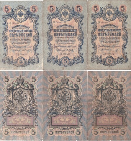 Набор 3 Кредитных билета 5 рублей 1909 года VF- Управляющий Коншин разные кассиры: Морозов, Я.Метц, Шмидт
