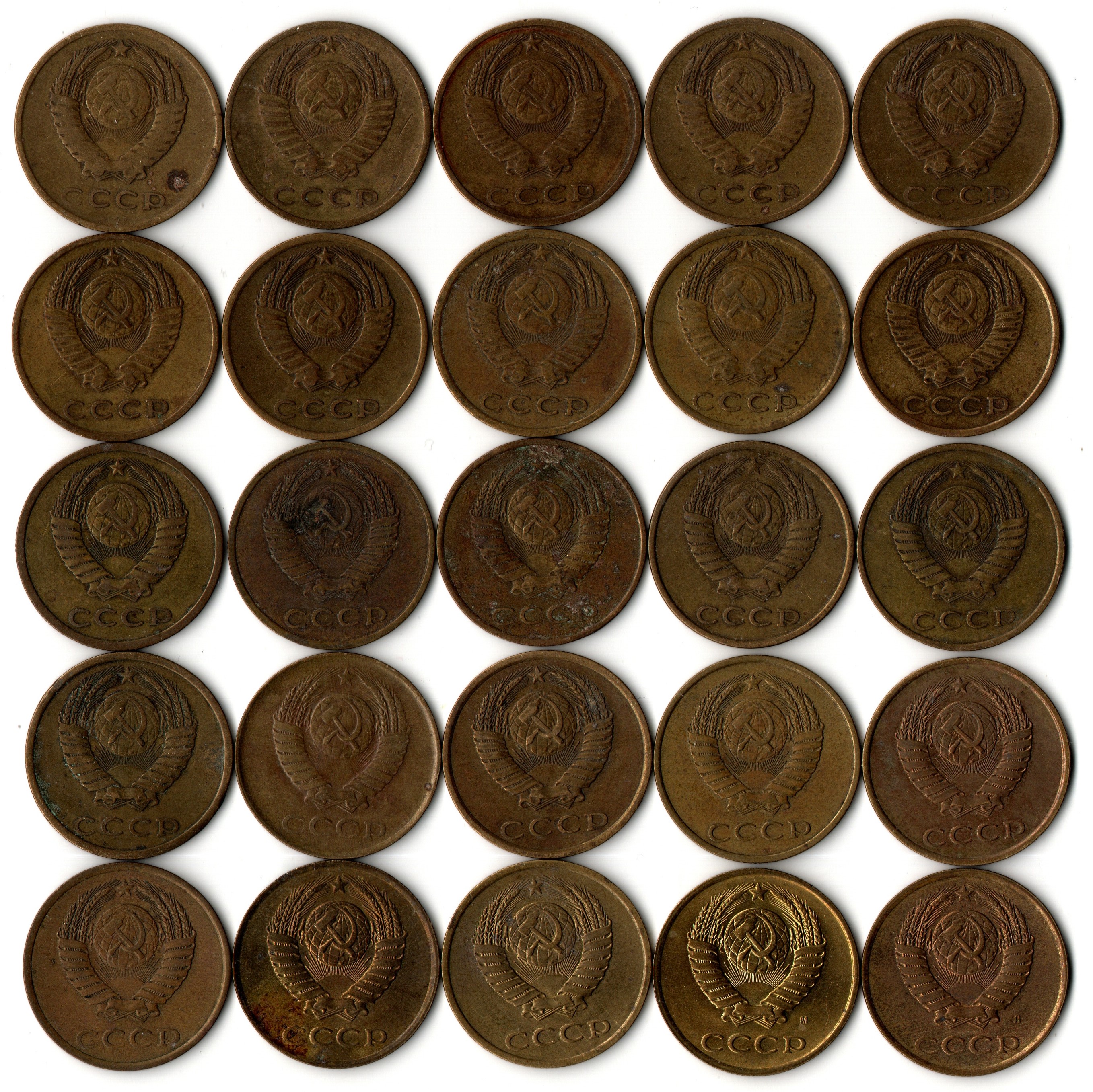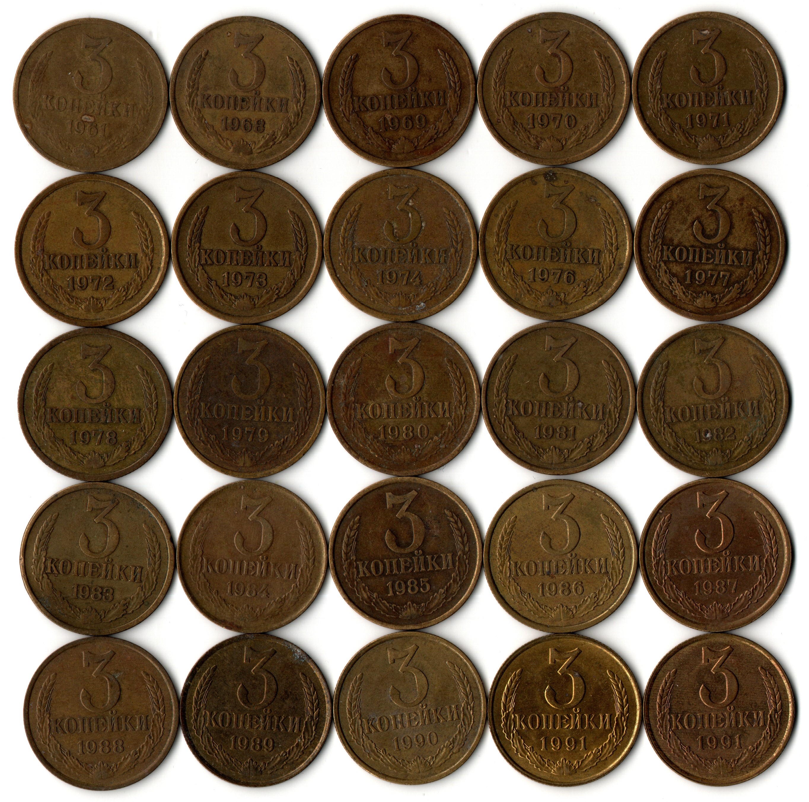 Набор 3 копейки СССР (25 монет): 1961,68,69,70,71,72,73,74,76,77,78,79,80,81,82,83,84,85,86,87,88,89,90,91М,91Л гг. VF