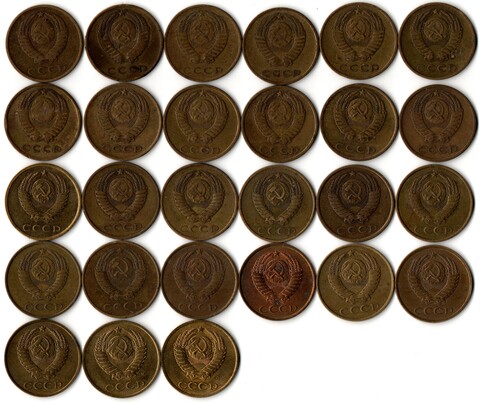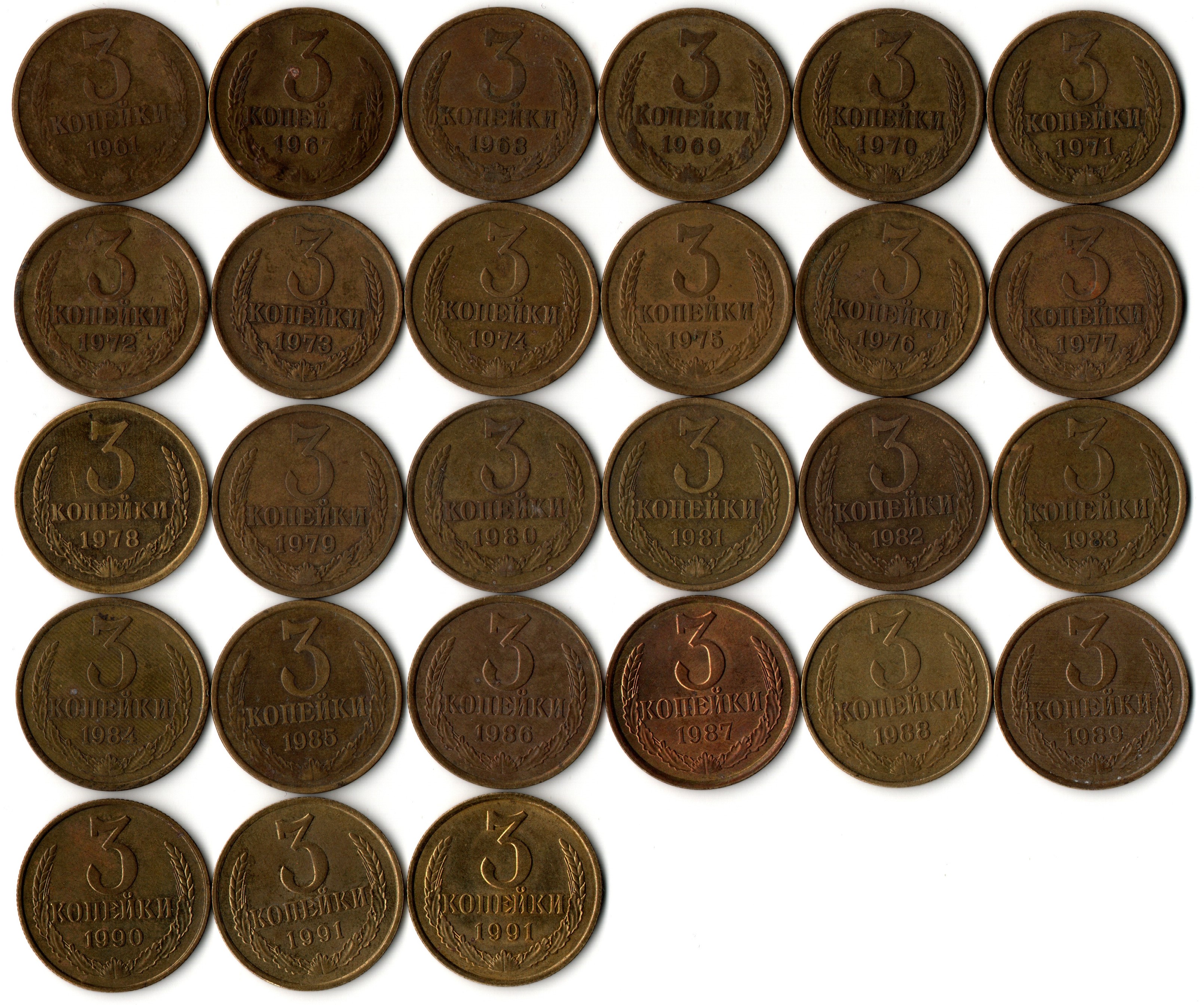 Набор 3 копейки СССР (27 монет) : 1961,67,68,69,70,71,72,73,74,75,76,77,78,79,80,81,82,83,84,85,86,87,88,89,90,91М,91Л гг. VF