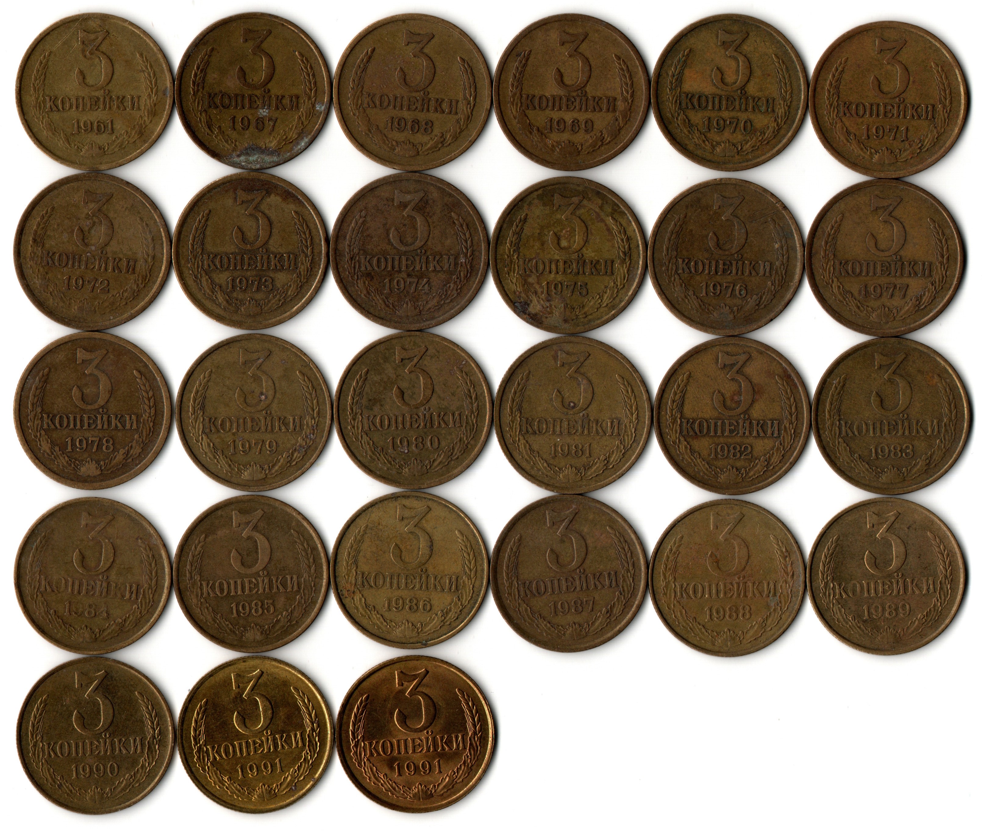 Набор 3 копейки СССР: 1961,67,68,69,70,71,72,73,74,75,76,77,78,79,80,81,82,83,84,85,86,87,88,89,90,91М,91Л гг. (27 монет) VF. Подборка трехкопеечных советских не чищенных монет из обращения по годам, 27 монет без повторов. В наборе присутствуют редкие монеты 3 копейки 1967 года и 3 копейки 1975 года