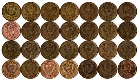 Набор 3 копейки СССР (28 монет) 1950, 55, 56, 57, 61, 68, 69-74, 76, 77, 78, 80- 90, 91л, 91 м