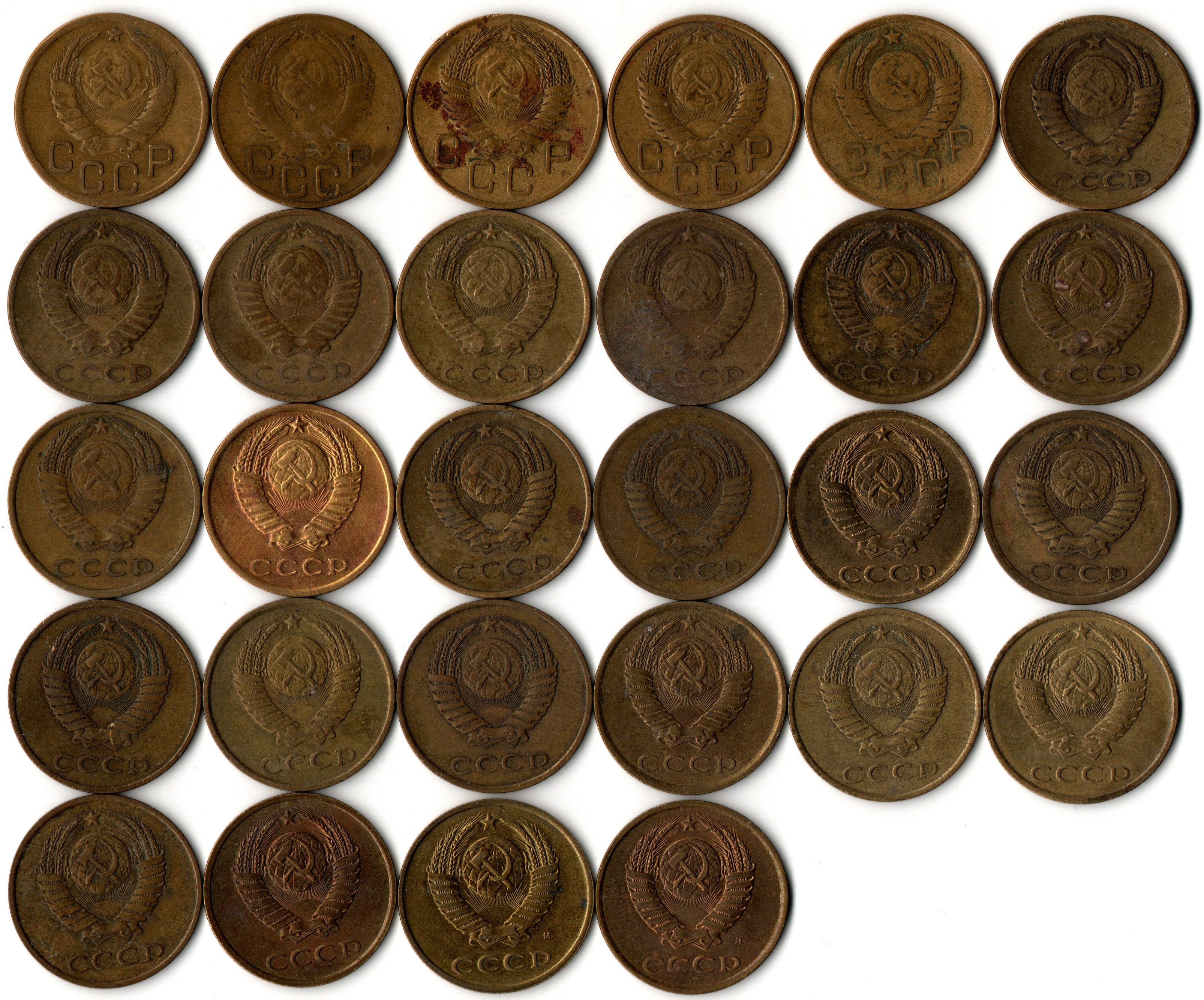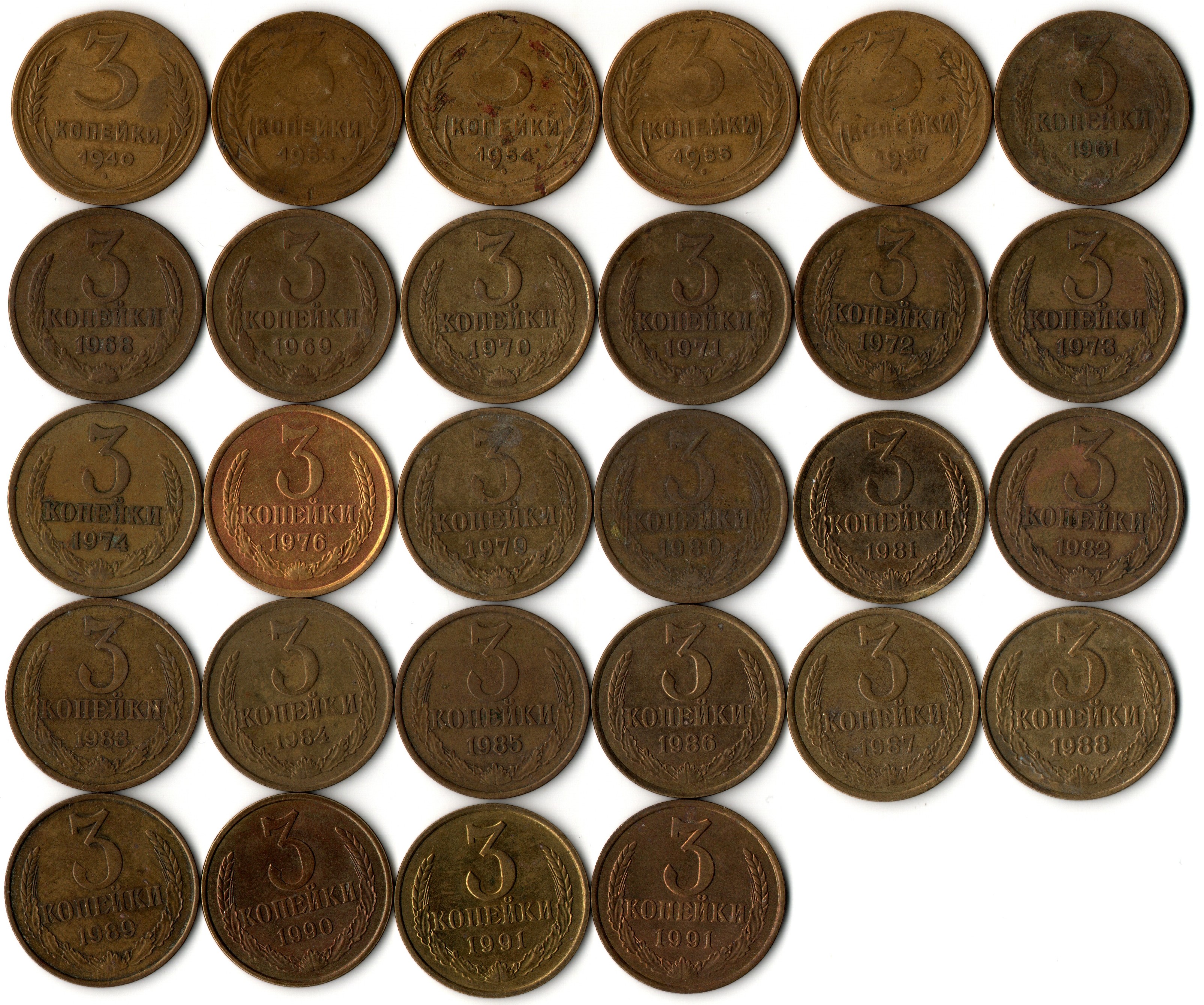 Набор 3 копейки СССР (28 монет): 1940,53 54,55,57,61,68,69,70,71,72,73,74,76,79,80,81,82,83,84,85,86,87,88,89,90,91М,91Л гг. VF. Подборка трехкопеечных советских не чищенных монет из обращения по годам,29 монет без повторов раннего СССР и позднего СССР.