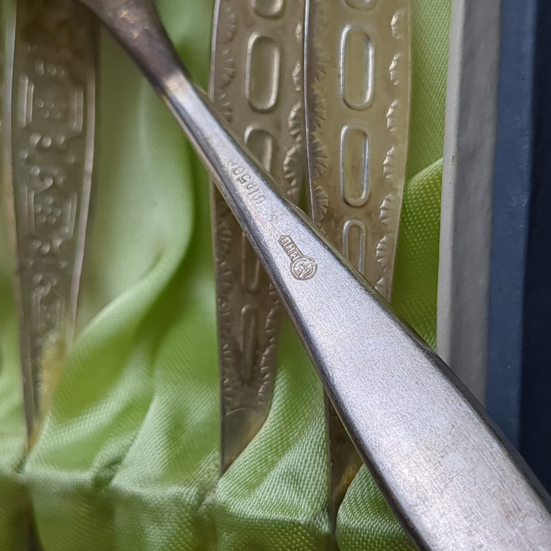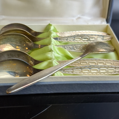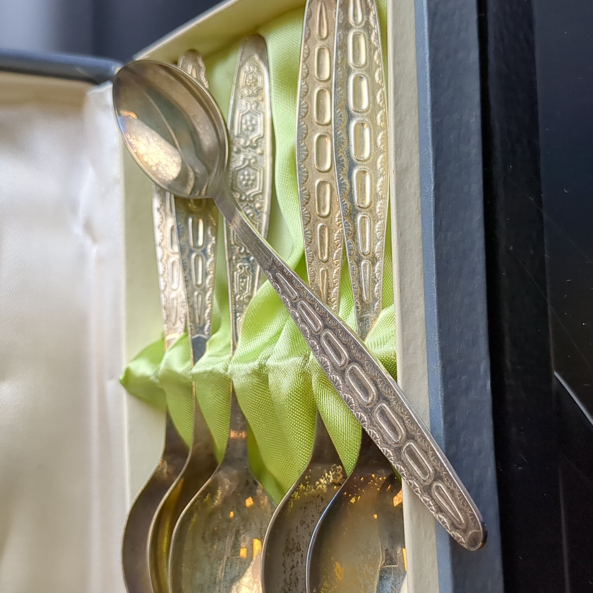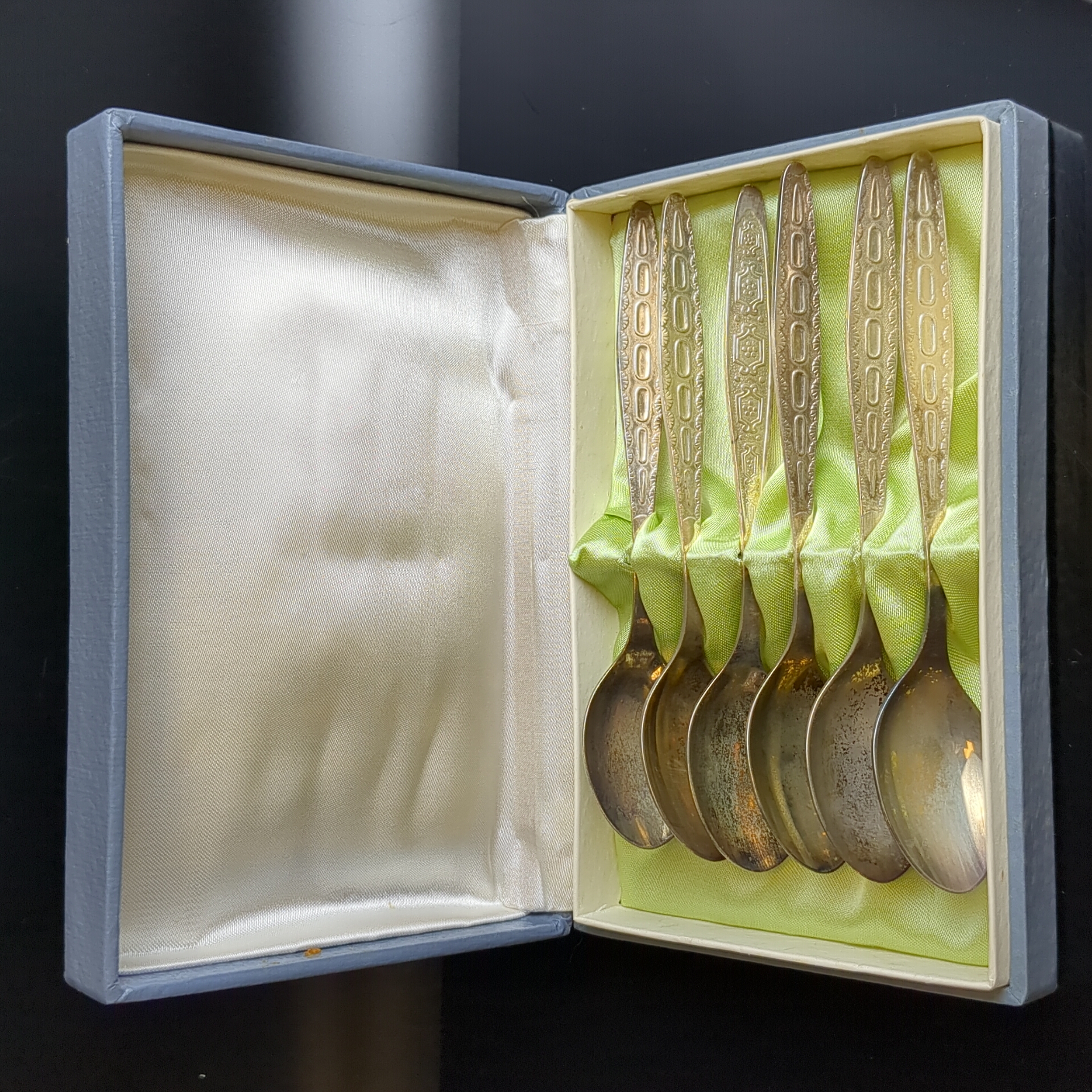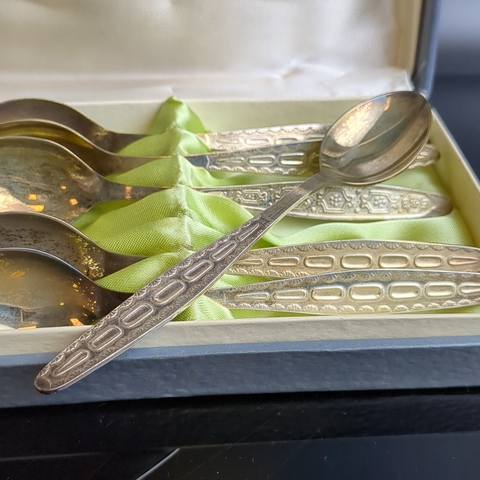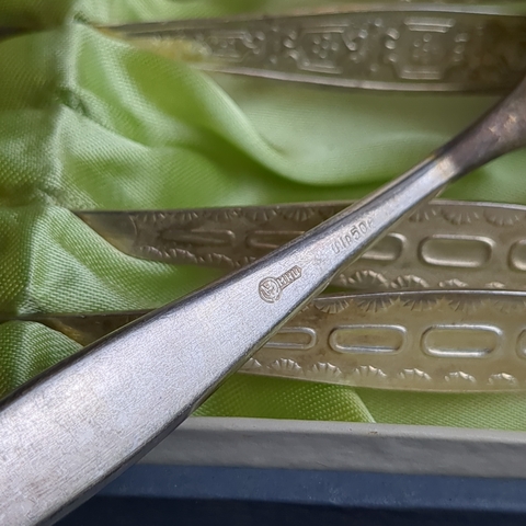 Набор 6 чайных ложек с геометрическим узором на 4 персоны, мНЦ (медь-никель-цинк), золочение, Кольчугинский завод цветных металлов, СССР, 1960-1990 гг. Кольчугино. На ложках естественная патина, не чистились. В оригинальной коробке
