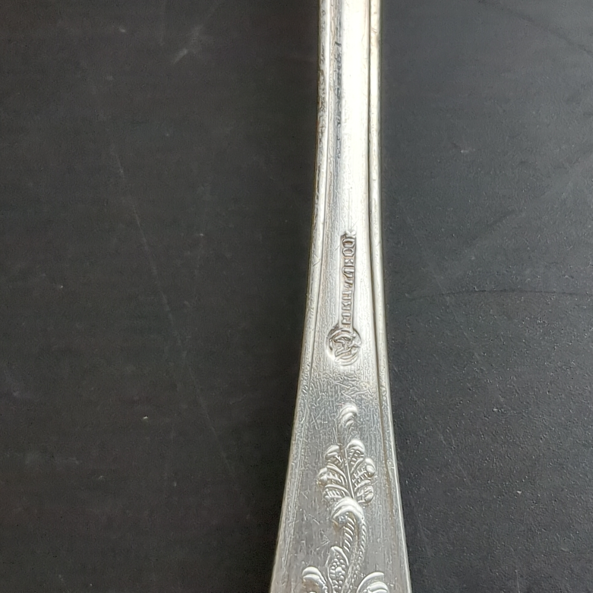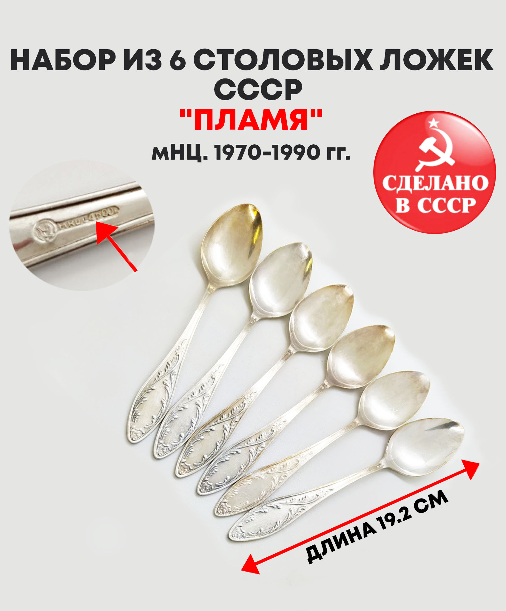 м НЦ (медь-никель-цинк), Кольчугинский завод цветных металлов, СССР, 1960–1980 гг. Элегантный винтажный набор столовых ложек «Пламя», выполненный в характерном для советского столового серебрения стиле. Ложки изготовлены из сплава мНЦ (медь-никель-цинк), известного своей прочностью, устойчивостью к коррозии и благородным серебристым оттенком. Ручки украшены изящным растительным орнаментом, плавно переходящим в вытянутый силуэт формы «Пламя», благодаря чему приборы выглядят утончённо и декоративно.