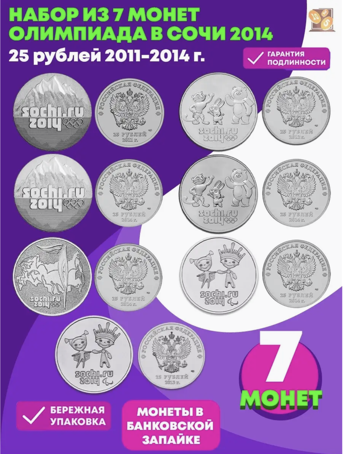 Набор 7 монет Сочи 2014 (Горы 2014,2011, Лучик 2013,2014, Факел 2014, Талисманы 2012, 2014)