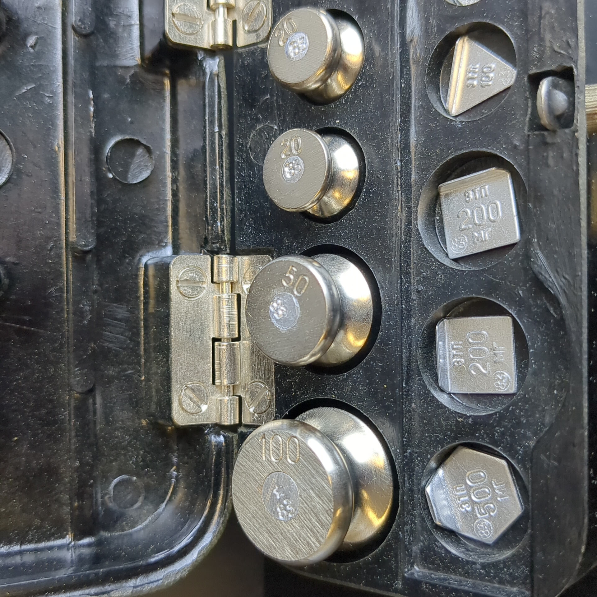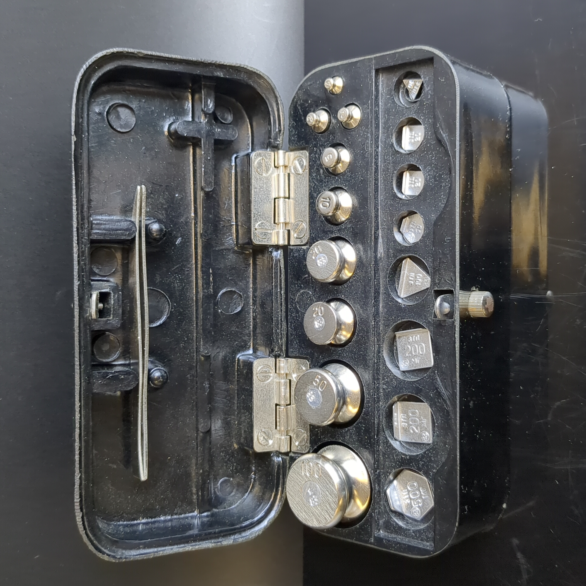 Набор гирь - разновесов в футляре, металл, эбонит, СССР, 1960 - 1970 гг. София Кофарджиев. СССР ГОСТ. гирьки разновесы. Пинцет в комплекте. Комплектация на фото