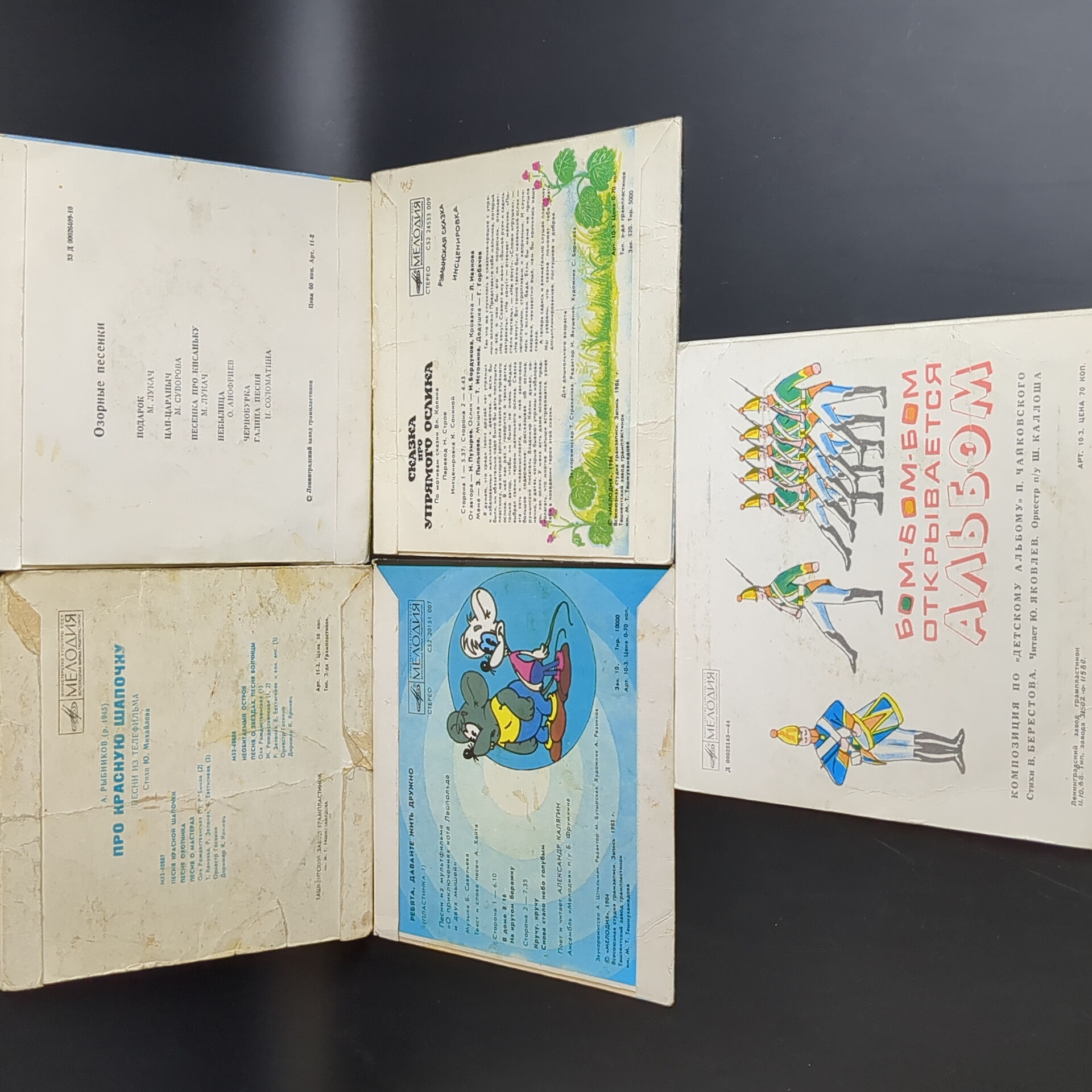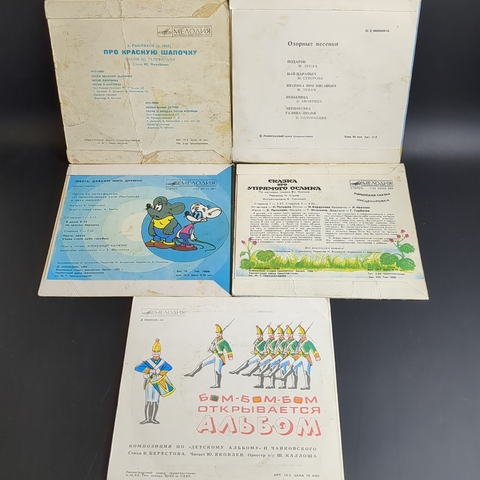 Набор из 10 виниловых пластинок 7 дюймов миньоны детские сказки и песни : Три поросенка / Ребята, давайте жить дружно - Кот Леопольд./ Сказка про упрямого ослика / Песни про красную шапочку / Озорные песенки / Котенок по имени Гав / Гуси - лебеди / Алиса в стране чудес / Почемучка Профессор и блоха. 10 Виниловых пластинок 7 дюймов. Мелодия СССР. Сказки для детей, детские сказки, детские песни. Конверты VG / Диски EX