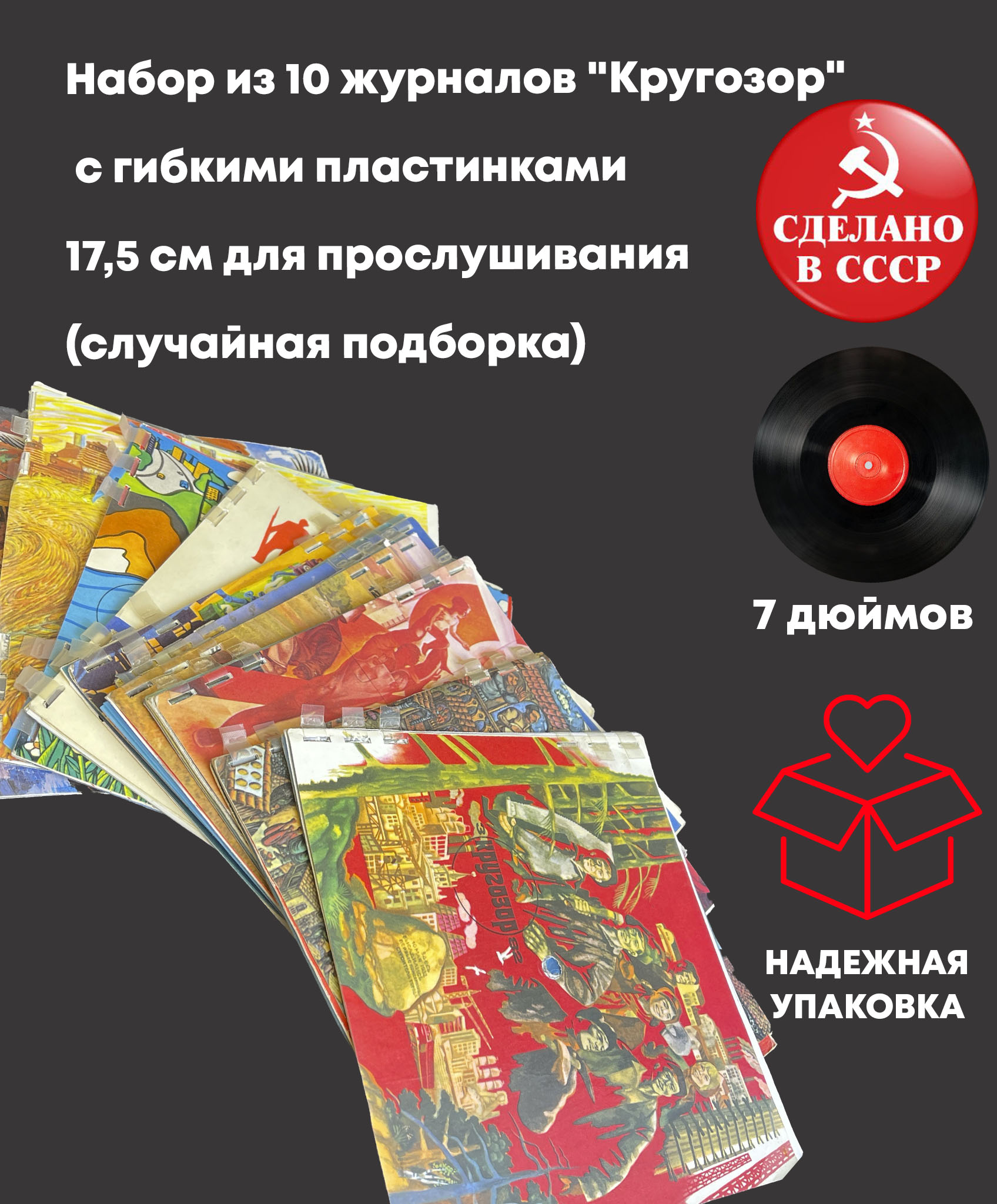 Получите сразу 10 советских журналов с пластинкам формата 17,5 см в одной покупке! Случайная подборка делает каждый комплект уникальным. Это идеальный вариант для коллекционеров, ценителей ретро-звука и тех, кто хочет открыть для себя новые музыкальные находки.