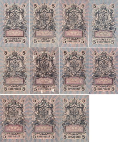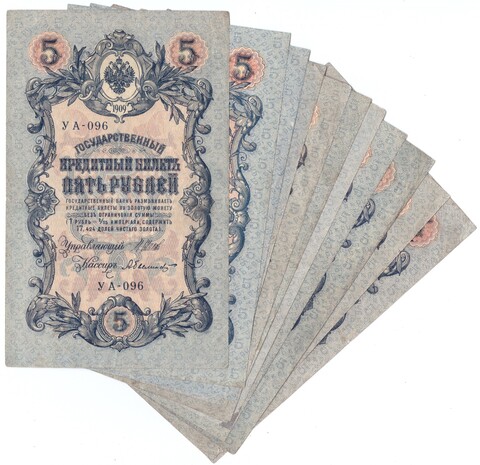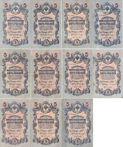 Набор из 11 кредитных билетов 5 рублей 1909 года. Управляющий Шипов. Набор разных кассиров.