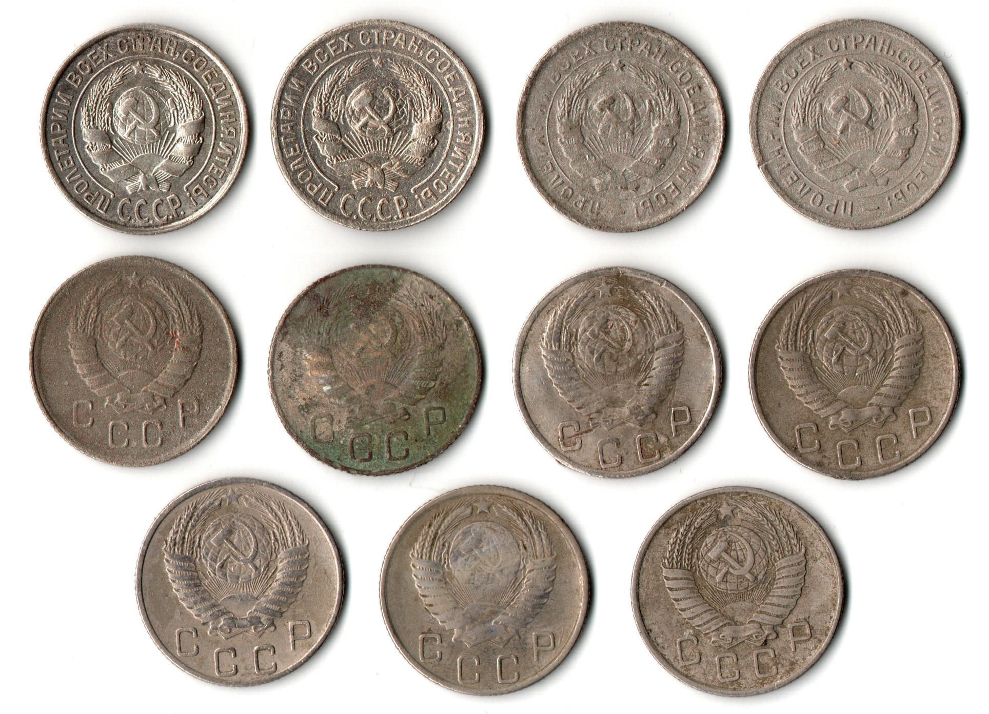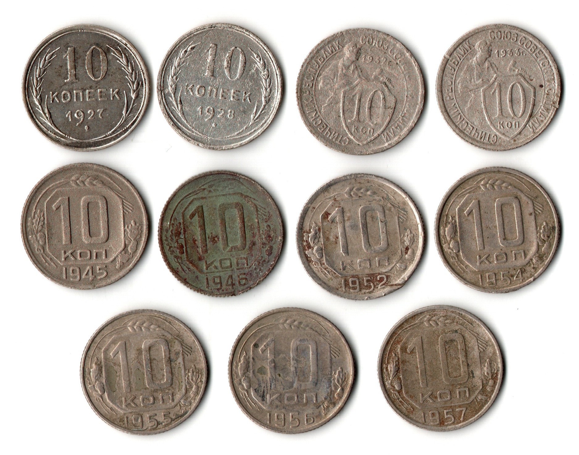 Набор из 11 монет 10 копеек 1927,28,32,33,45,46,52,54,55,56,57 гг. Ранний СССР