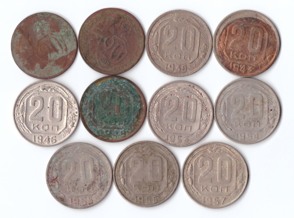 Набор из 11 монет 20 копеек (1931, 1932, 1936, 1943, 1946, 1948, 1953-1957 гг.) №2