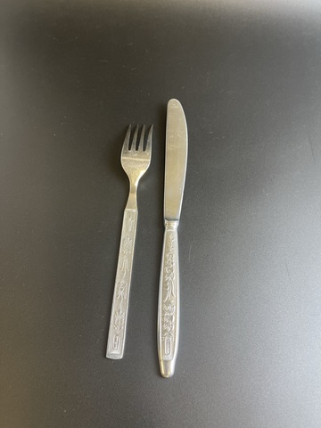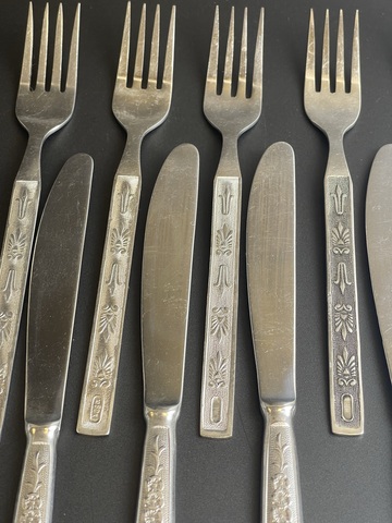 Набор из 11 столовых вилок и 11 столовых ножей советских времен, нержавейка , узоры, винтаж СССР. Присутствуют следы использования - состояние и комплектация на фото