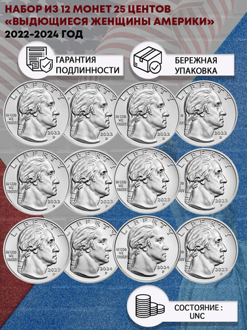 Набор из 12 монет 25 центов Выдющиеся женщины Америки 2022 - 2024 г. без повторов, монетные дворы случайные P/D.