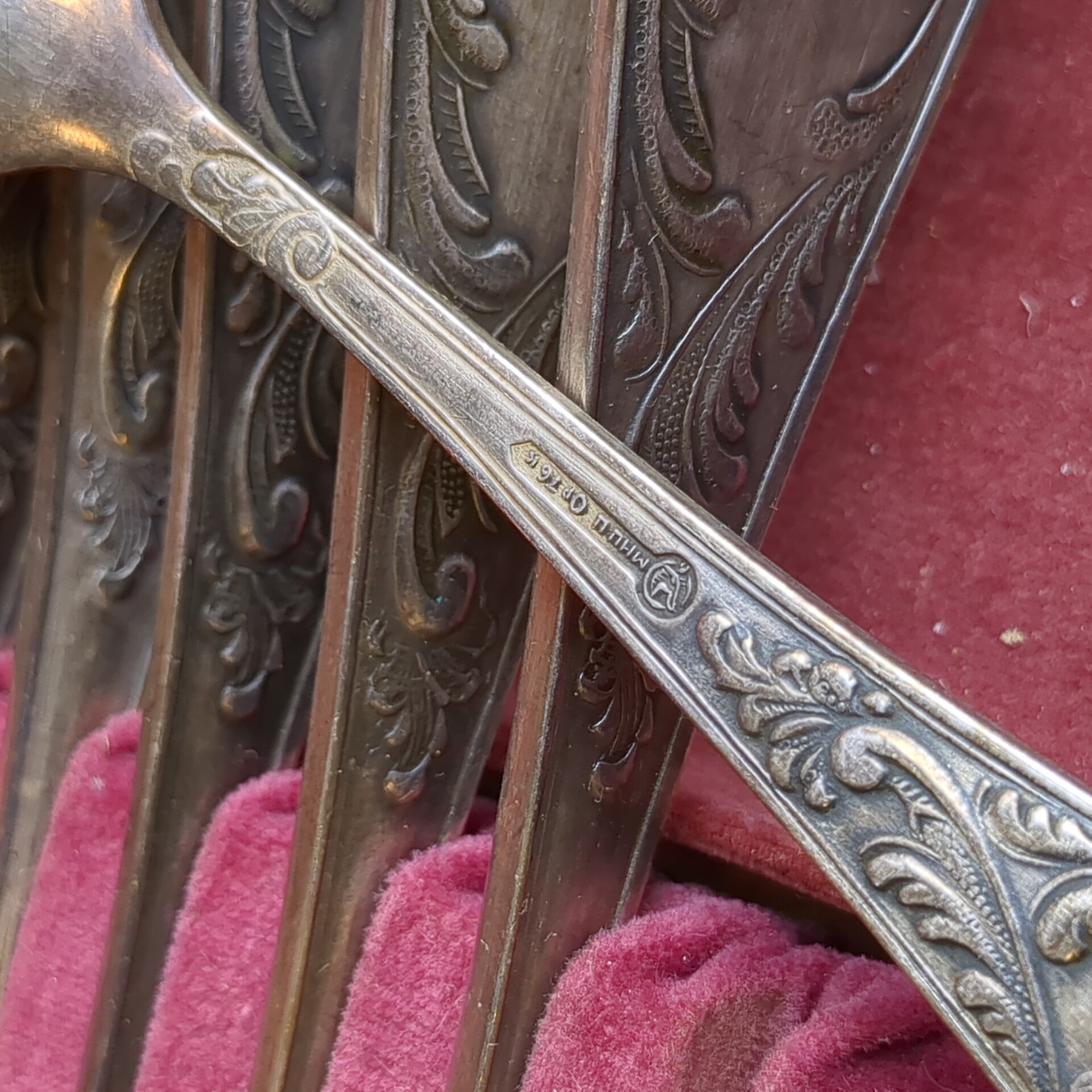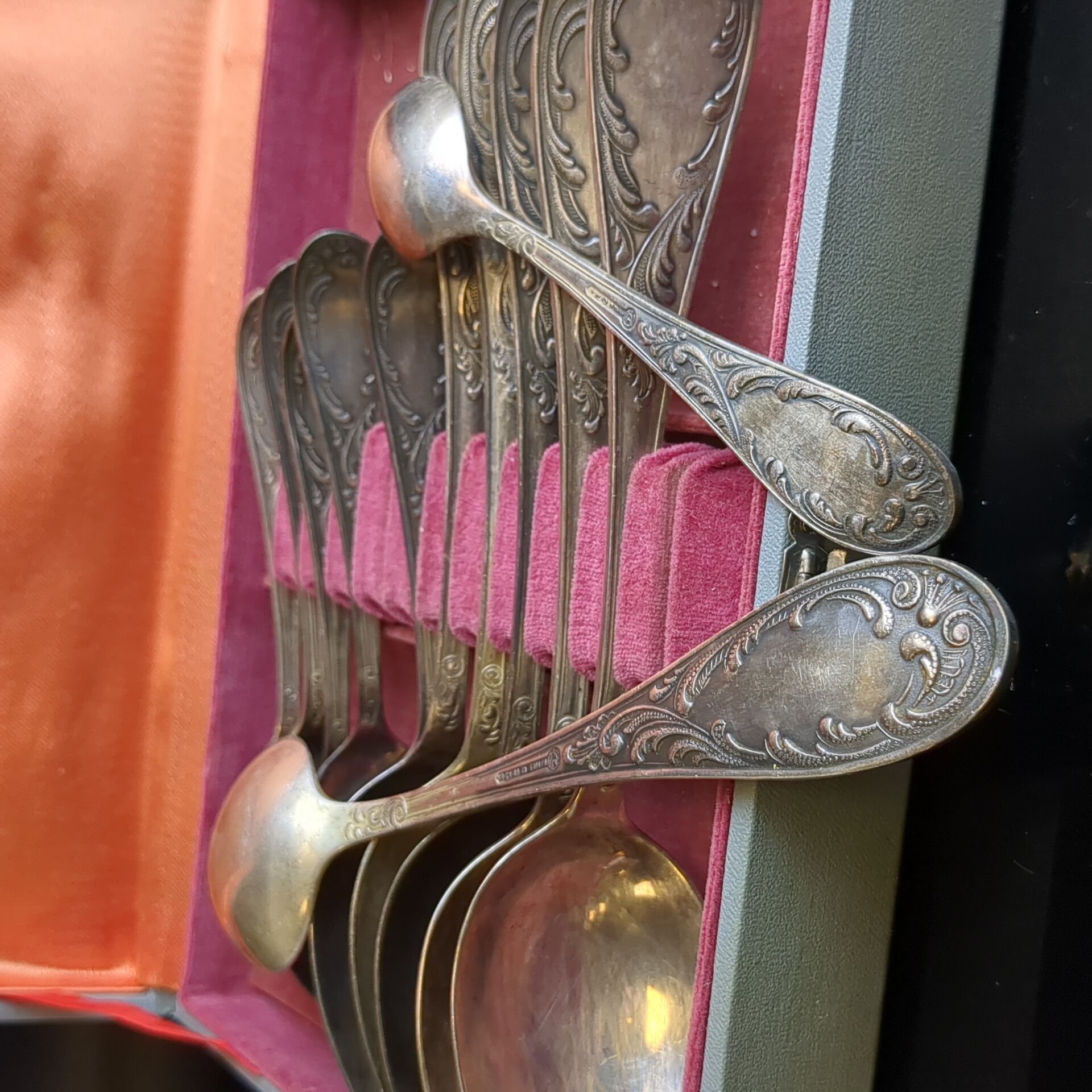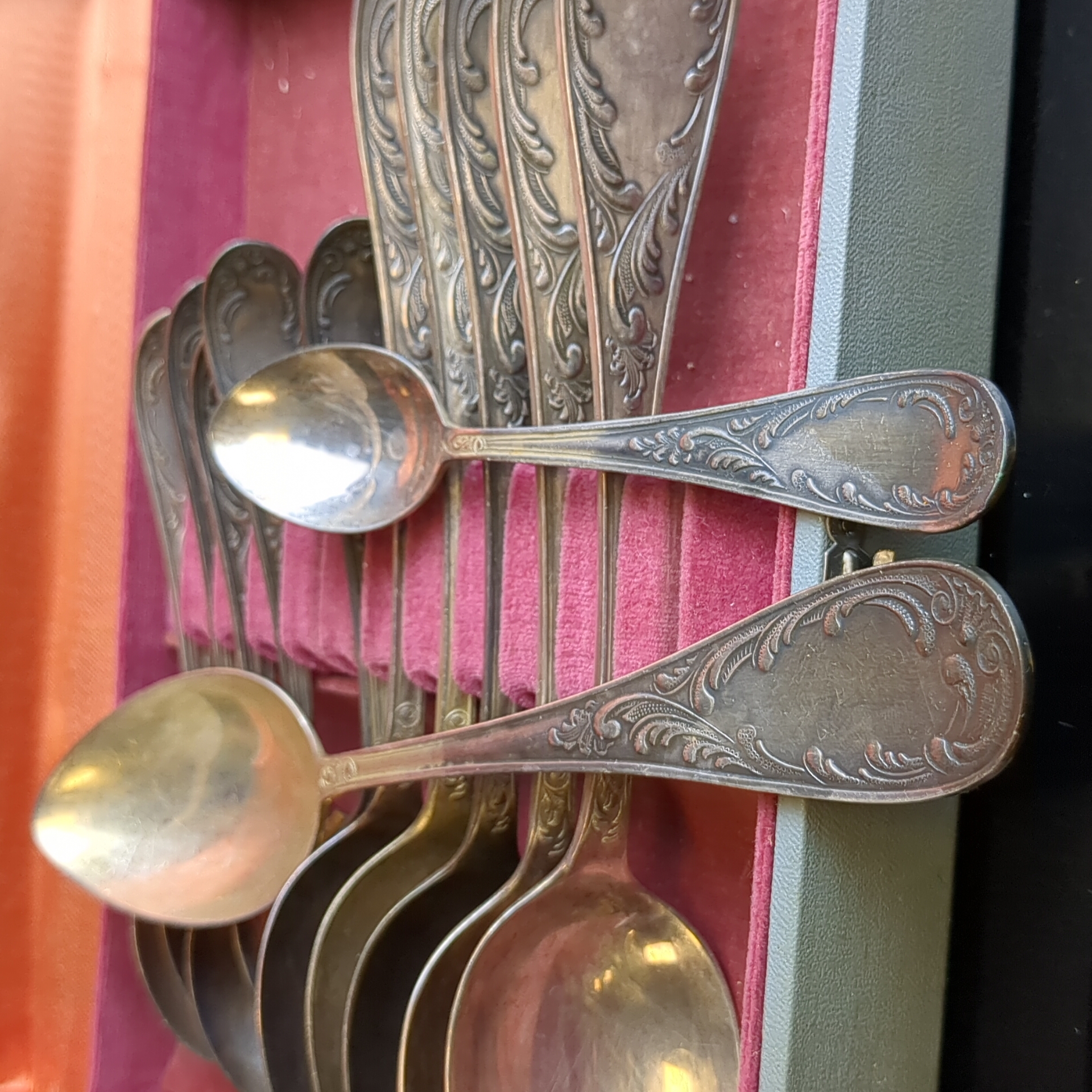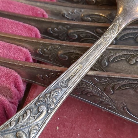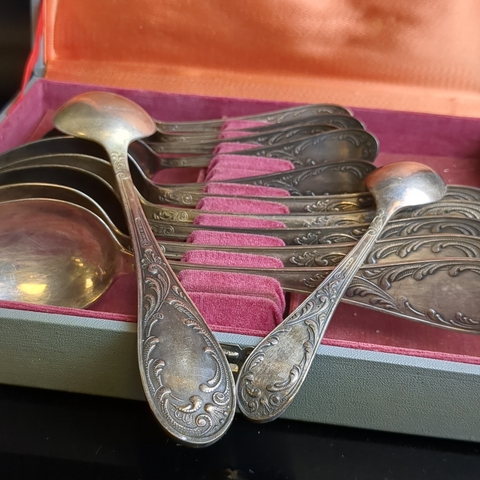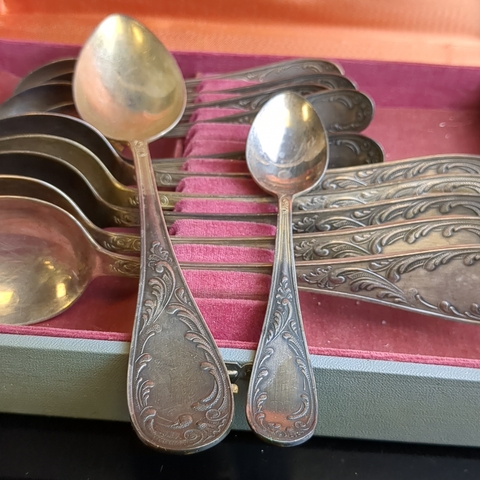 Набор из 12 предметов, 6 столовых и 6 чайных ложек "Пламя" с растительным декором в коробке, мНЦ (медь-никель-цинк), Кольчугинский завод цветных металлов, СССР, 1960-1980 гг.