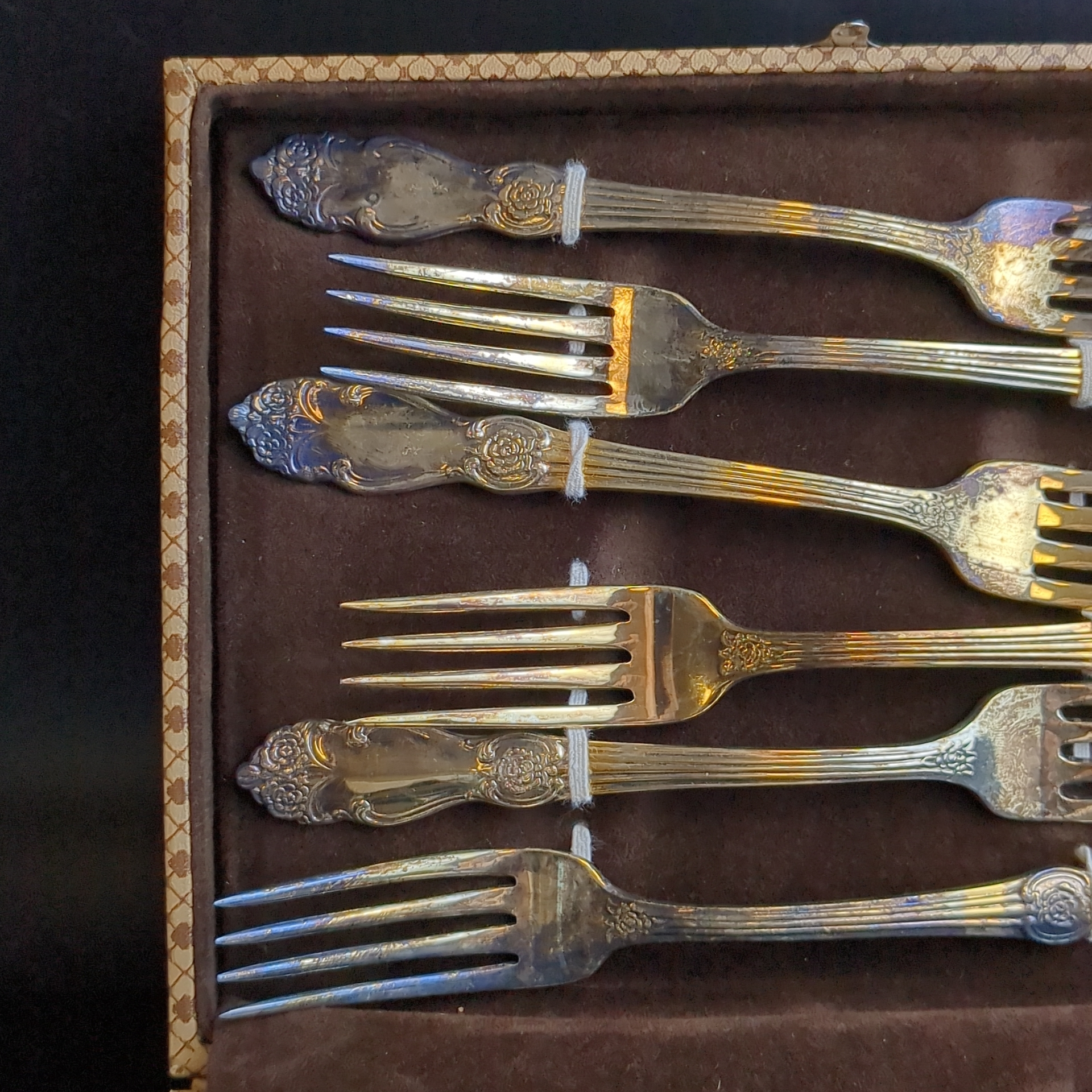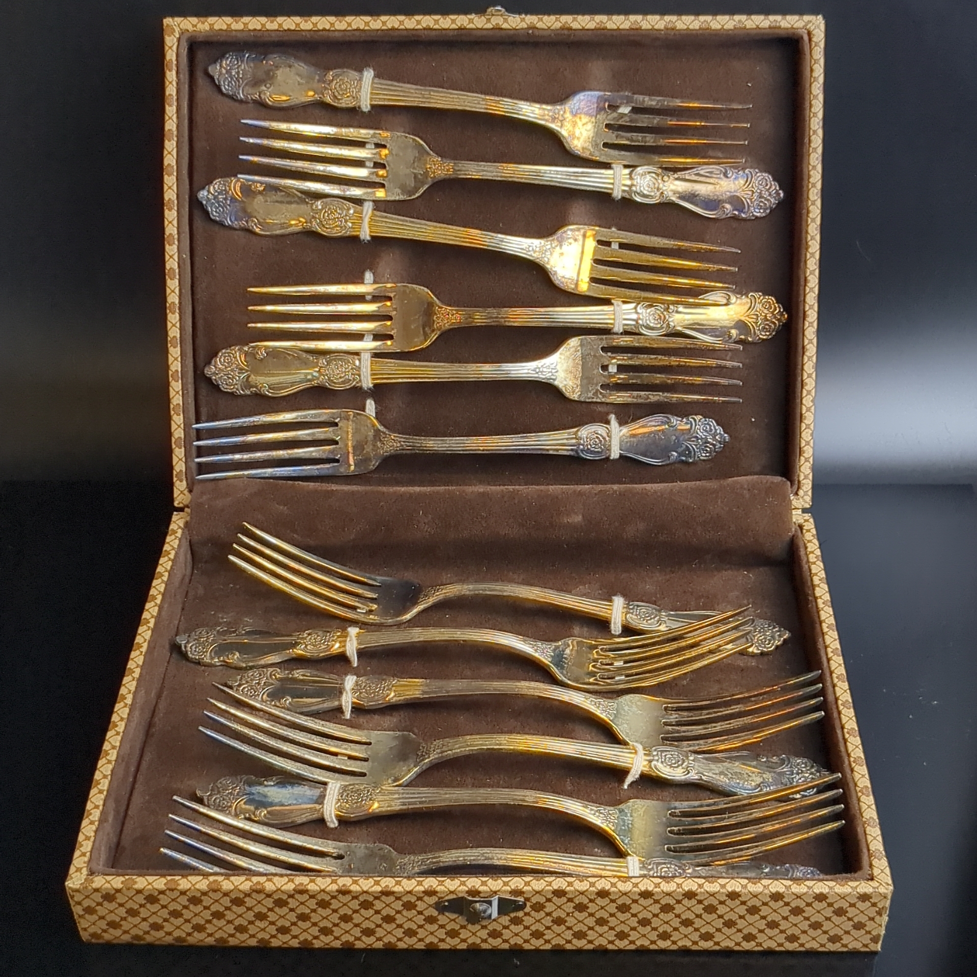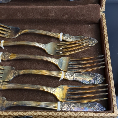 Набор из 12 столовых вилок "Золотая роза", мНЦ (медь-никель-цинк), золочение, Кольчугинский завод цветных металлов, СССР, 1970-1990 гг.