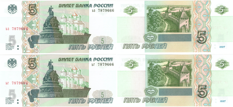 Набор из 2 банкнот 5 рублей 1997 Красивый номер 7879666 с разными сериями ьз, ьг
