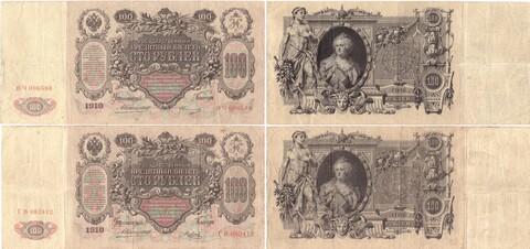 Набор из 2 кредитных билетов 100 рублей 1910 года. Управляющий Коншин. Набор разных кассиров.
