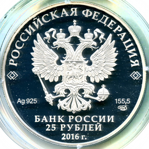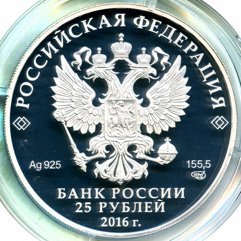 Аверс: на зеркальном поле диска – рельефное изображение Государственного герба Российской Федерации, над ним вдоль канта – надпись полукругом: "РОССИЙСКАЯ ФЕДЕРАЦИЯ", обрамленная с обеих сторон сдвоенными ромбами, внизу под гербом: слева – обозначения драгоценного металла и пробы сплава, справа – содержание химически чистого металла и товарный знак монетного двора, внизу в центре в три строки – надпись: "БАНК РОССИИ", номинал монеты: "25 РУБЛЕЙ", год выпуска: "2016 г.".
