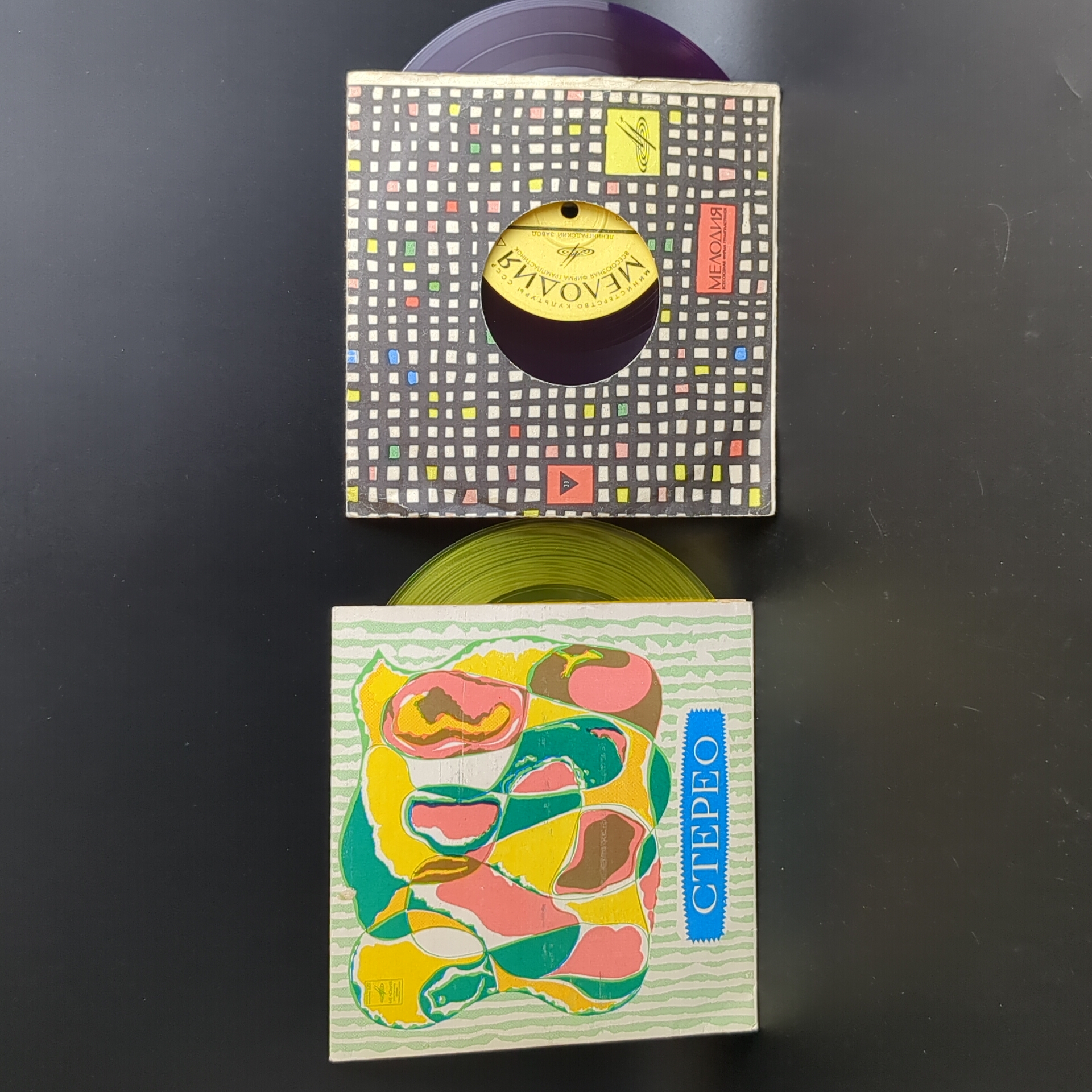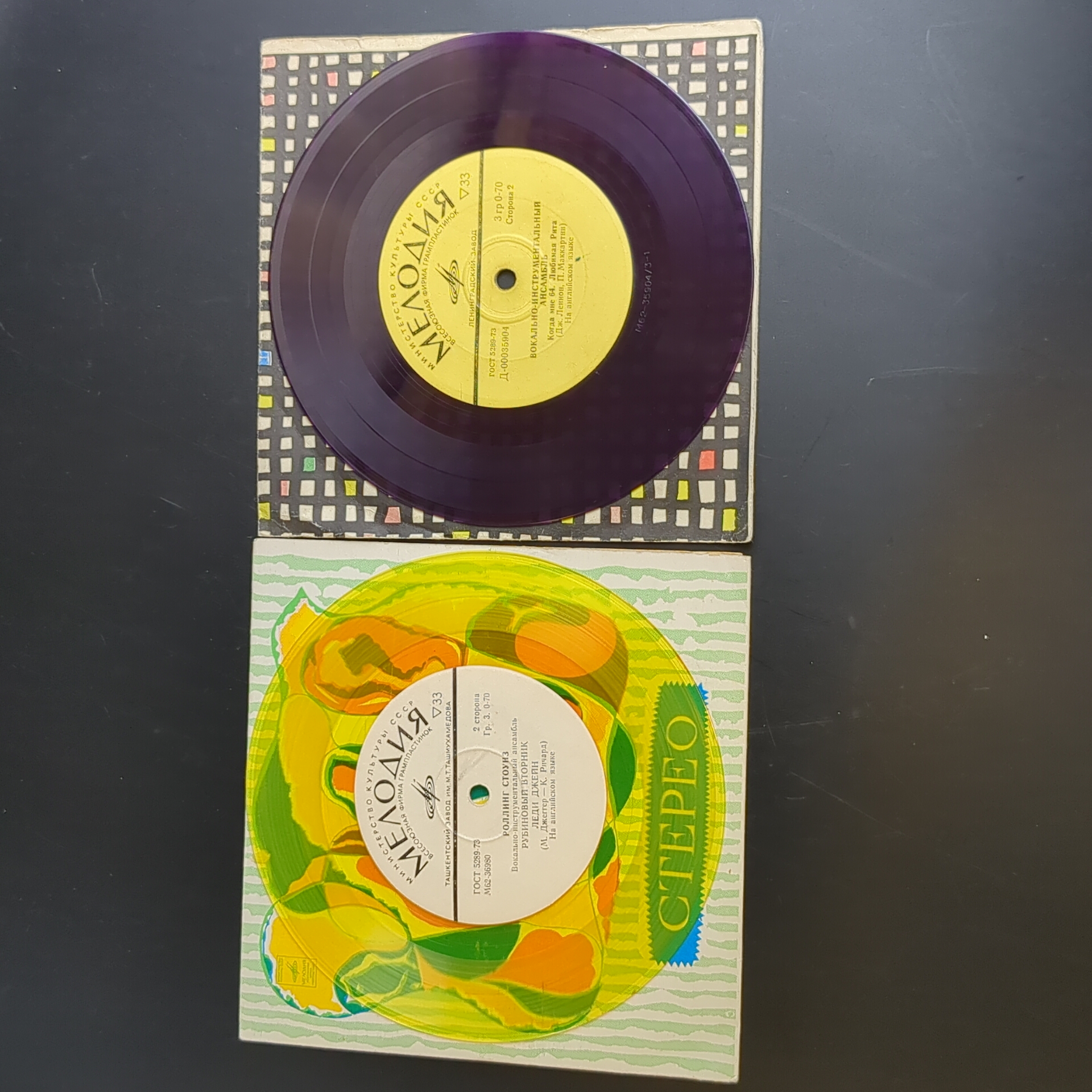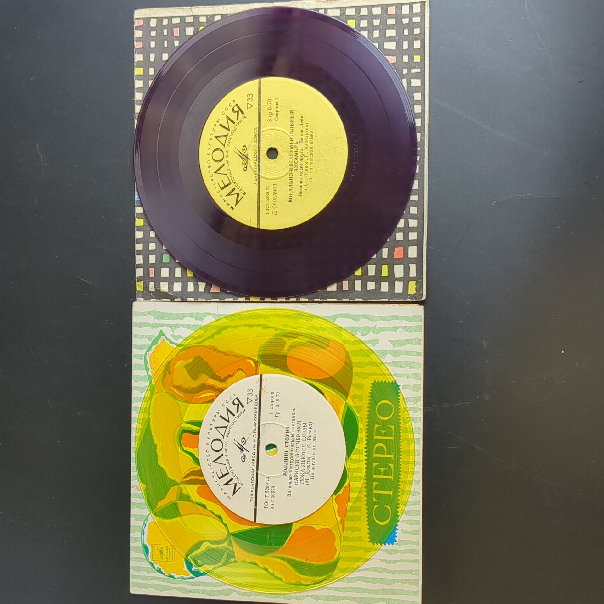 Набор из 2 цветных пластинок : Rolling Stones - Роллинг Стоунз / Paul McCartney - Пол Маккартни / J. Lennon - Дж. Леннон. 2 Виниловые пластинки 7 дюймов. Мелодия СССР.