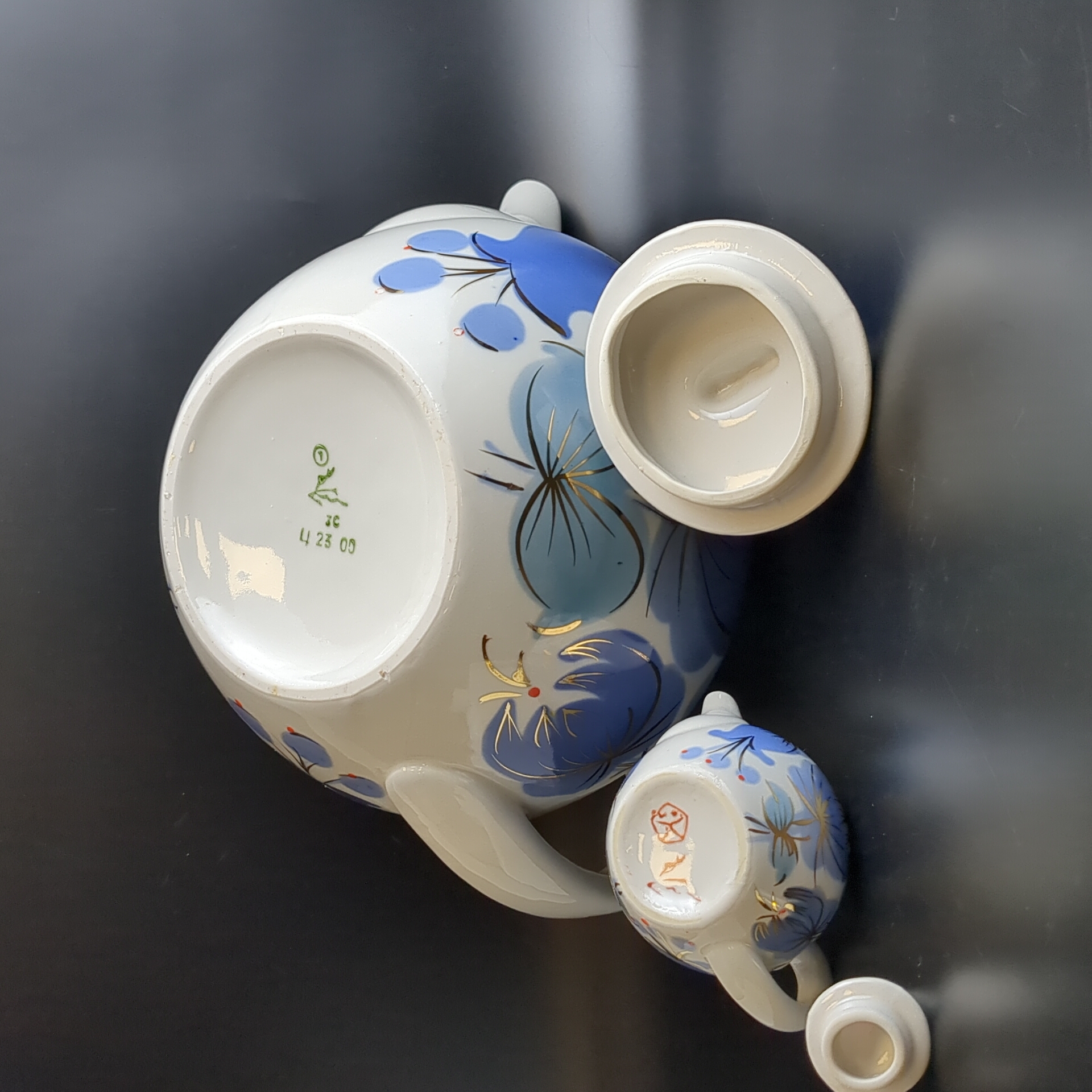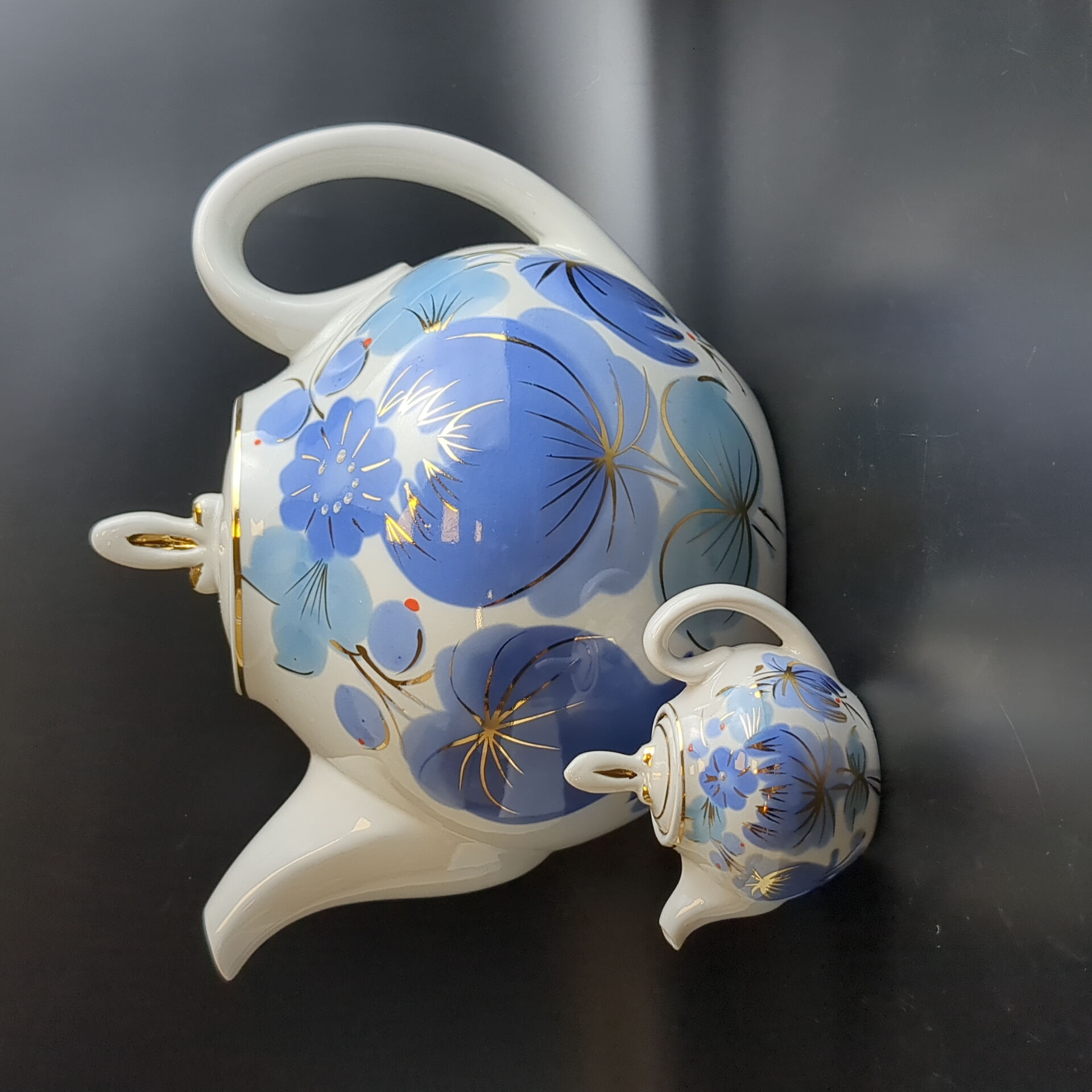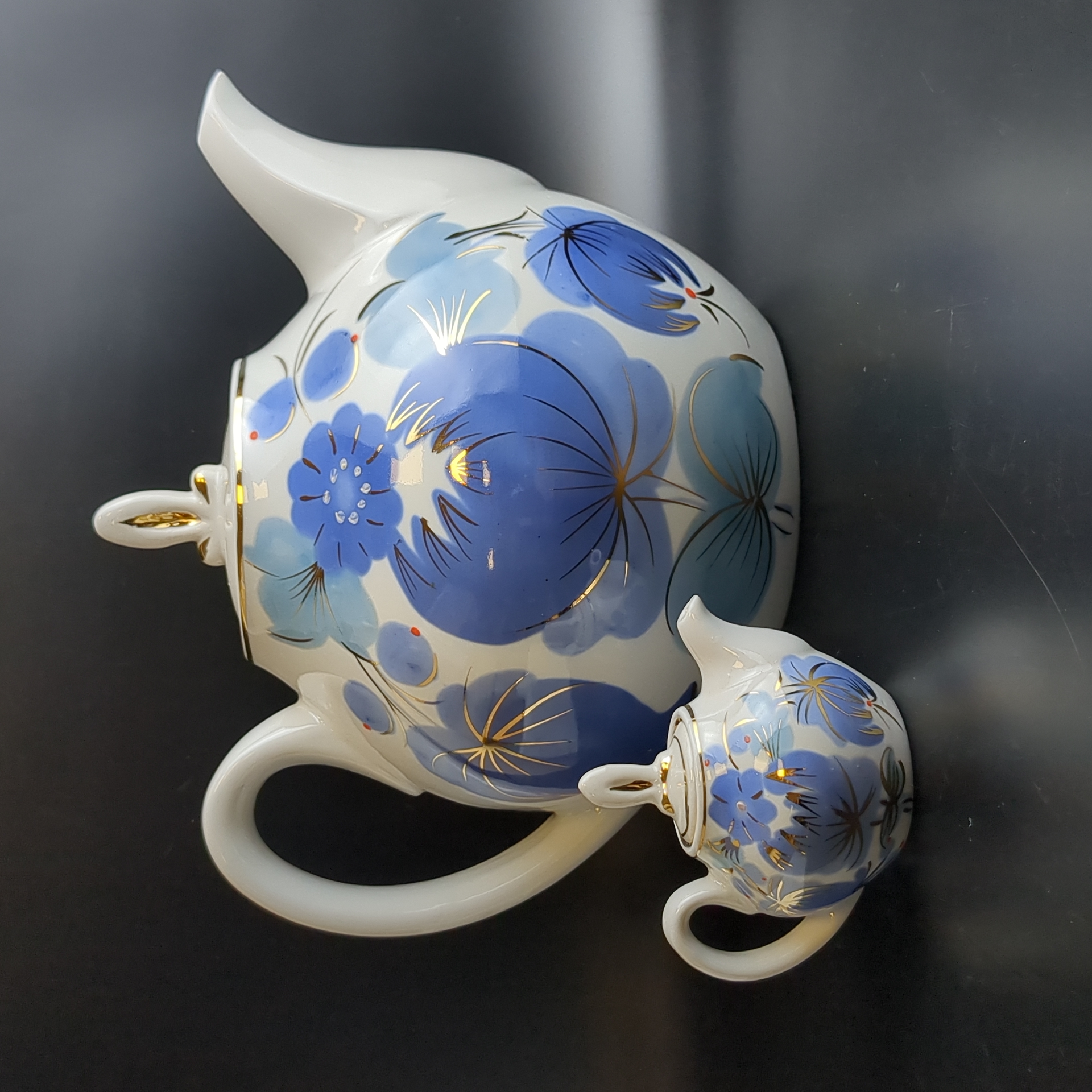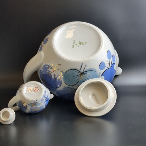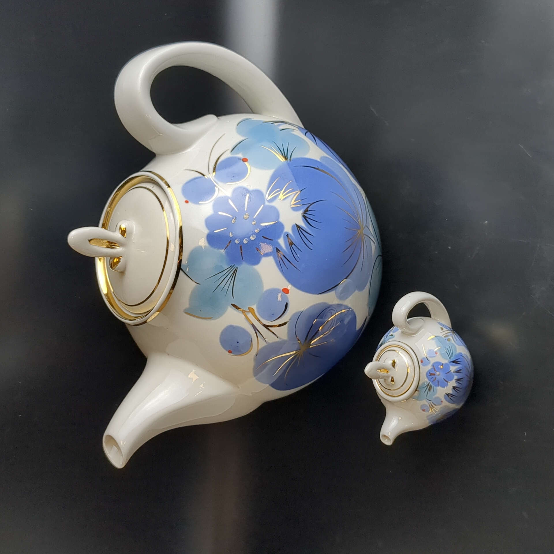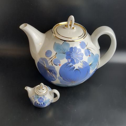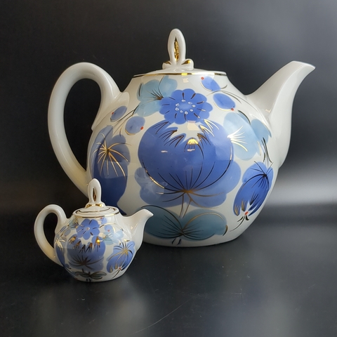 Набор из 2х чайников разного размера доливной и заварочный, фарфор, цветочный декор, золочение, Городницкий ФЗ, винтаж СССР 1970-1990 гг. Высота поливного чайника - 21 см. Высота маленького чайника - 7.5 см.