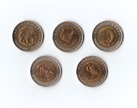 Набор из 5 монет "Красная книга" 1993 год (Тетерев, Медведь, Зублефар, Афалина, Аист)