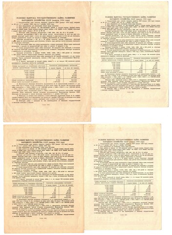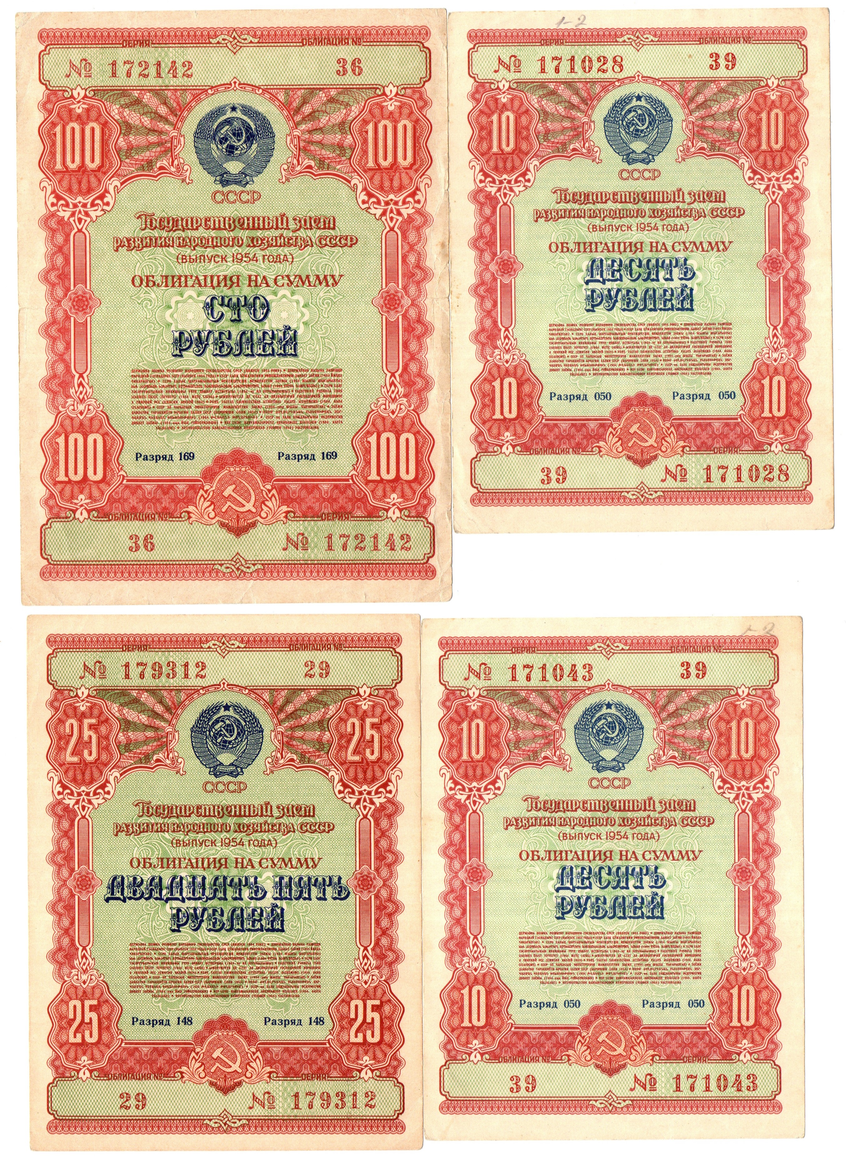 Набор из 4 Облигаций 10, 25, 100 рублей 1954 год CCСР. Государственный заем народного хозяйства СССР