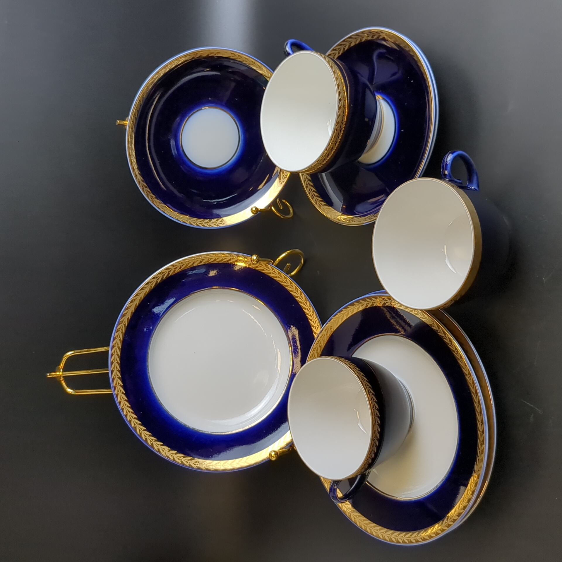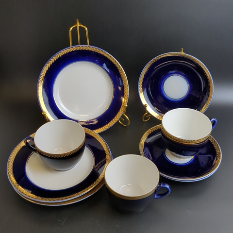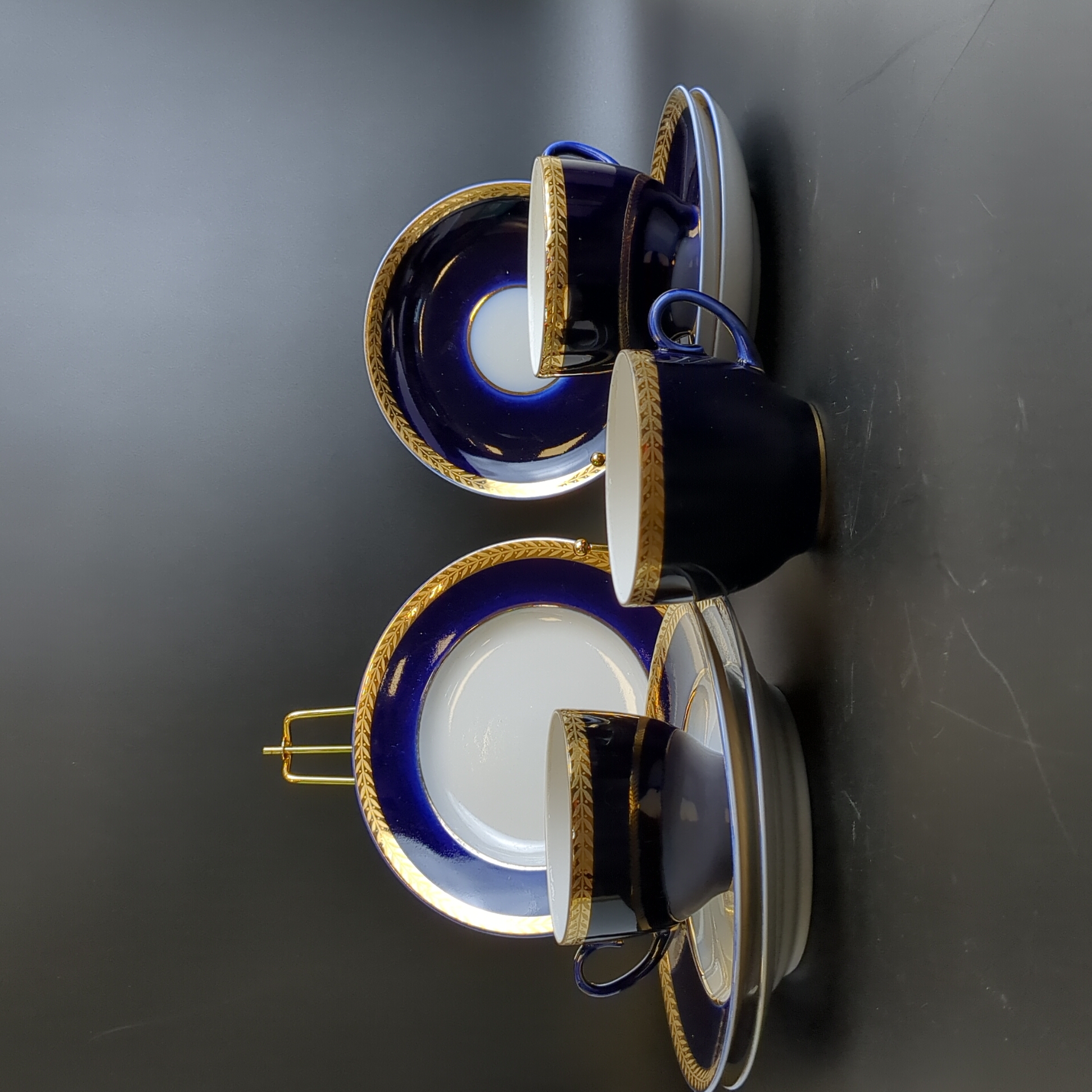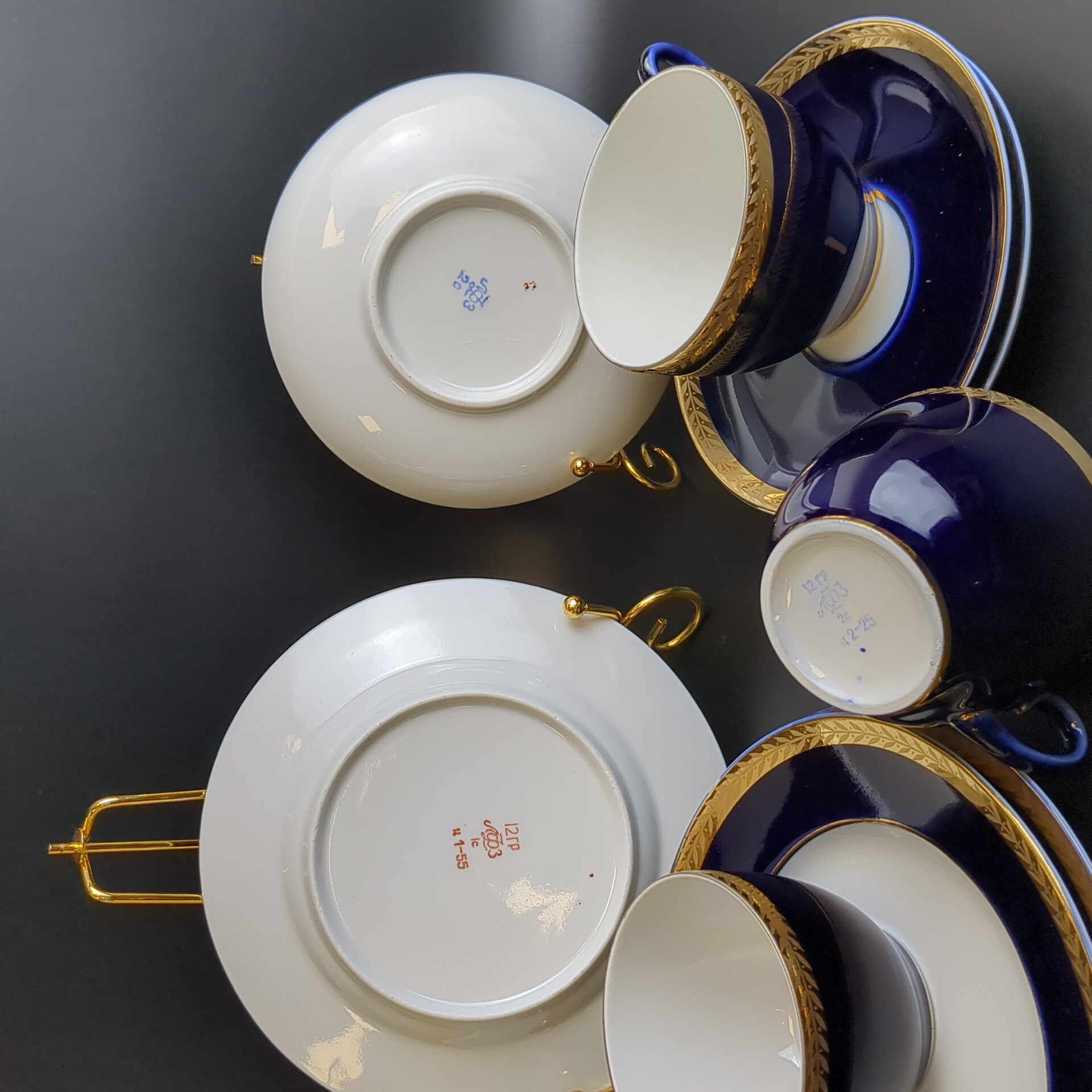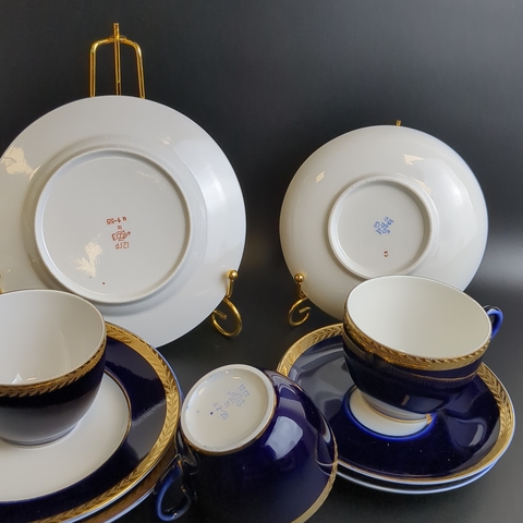 Набор из 3х чайных трио (9 предметов), фарфор ЛФЗ, кобальт с позолотой, винтаж СССР 1970-1990 гг. Диаметр блюдец 17.5 и 14.5 см. Высота кружки - 6.3 см. Состояние и комплектация на фото, присутствуют следы бытования - царапинки
