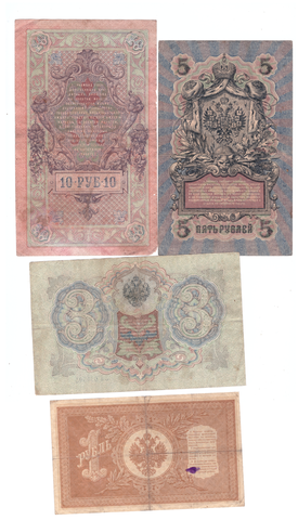 Набор из 4 банкнот Российской империи (1,3,5 и 10 рублей) VG-F