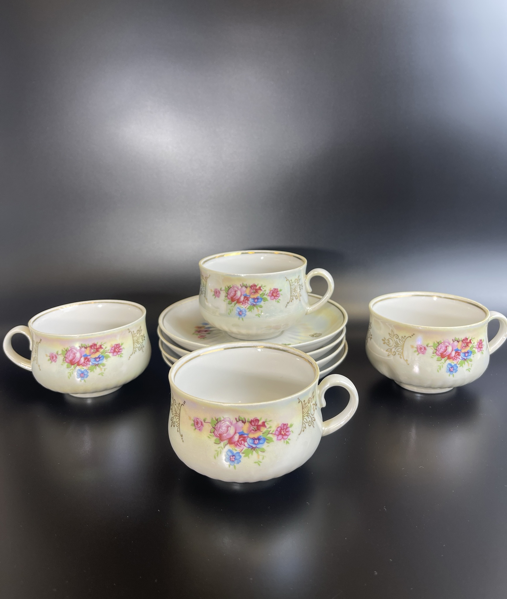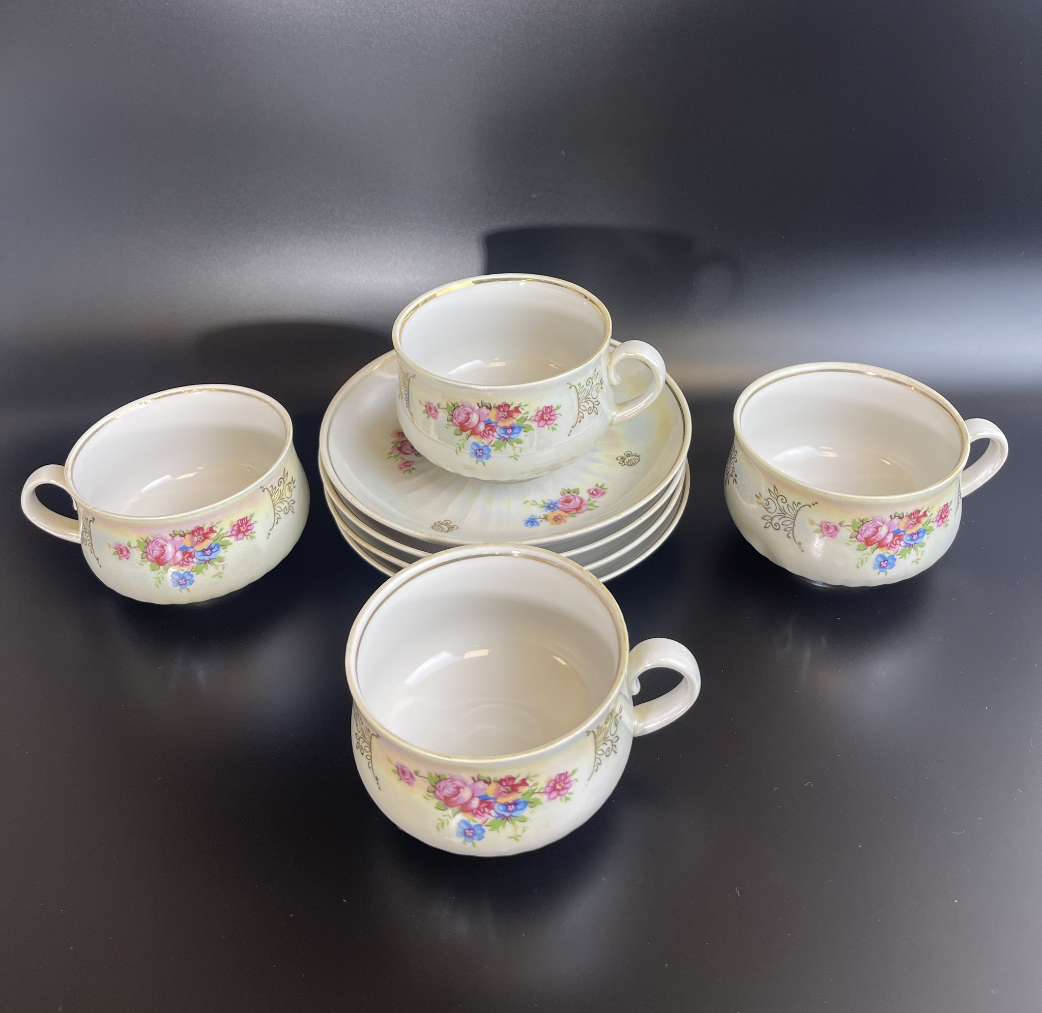 Набор из 4 чайных пар клеймо Дулево, роспись цветы и позолота, перламутр винтаж. Высота чашки- 5.5 см, диаметр чашки - 8 см, диаметр блюдца - 14 см.