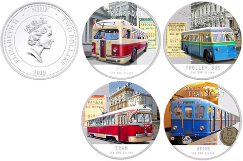 Набор из 4 монет 2 доллара. Советский городской транспорт. Ниуэ. 2010 год