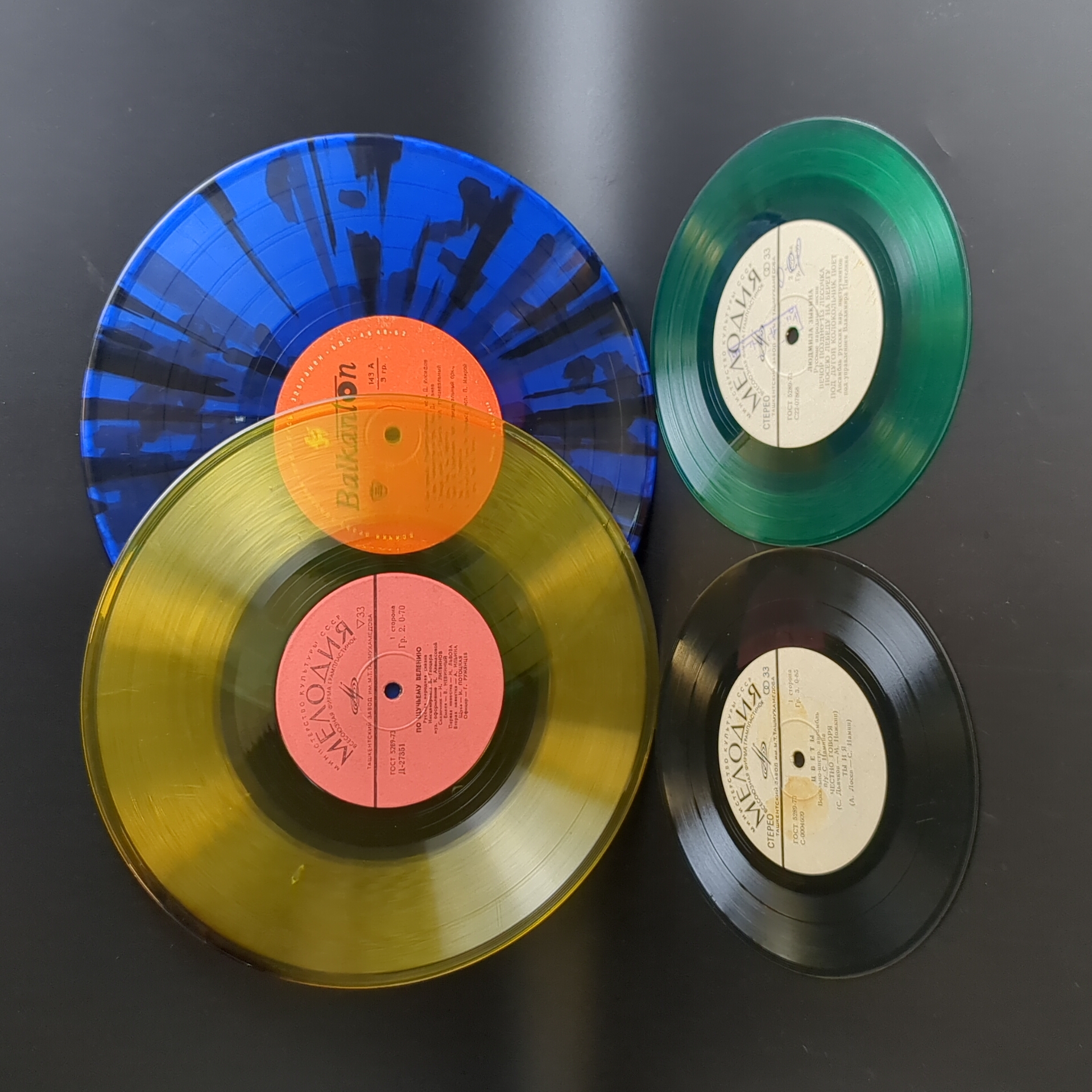 Набор из 4 цветных пластинок для декора. 4 Виниловые пластинки 10 и 7 дюймов миньоны / цветные редкие коллекционные пластинки. На пластинках присутствую царапины, продаются как для декора интерьера и для поделок. Состояние на фото. Жёлтый винил, сине - чёрный винил, зеленый винил, чёрно - жёлтый. Панно на стене из пластинок может стать классическим вариантом декора. Стильное оформление подвесными пластинками на разных уровнях пользуется популярностью в ресторанах и барах в стиле 60-х-70-х. Сделать настенные часы станет еще одним интересным решением, этим точно можно удивить друзей и гостей. А еще, пластинки можно сделать виде вешалок, стильного ретро-табурета, экстравагантной люстры или создать свою необычную и неповторимую композицию для декора.
