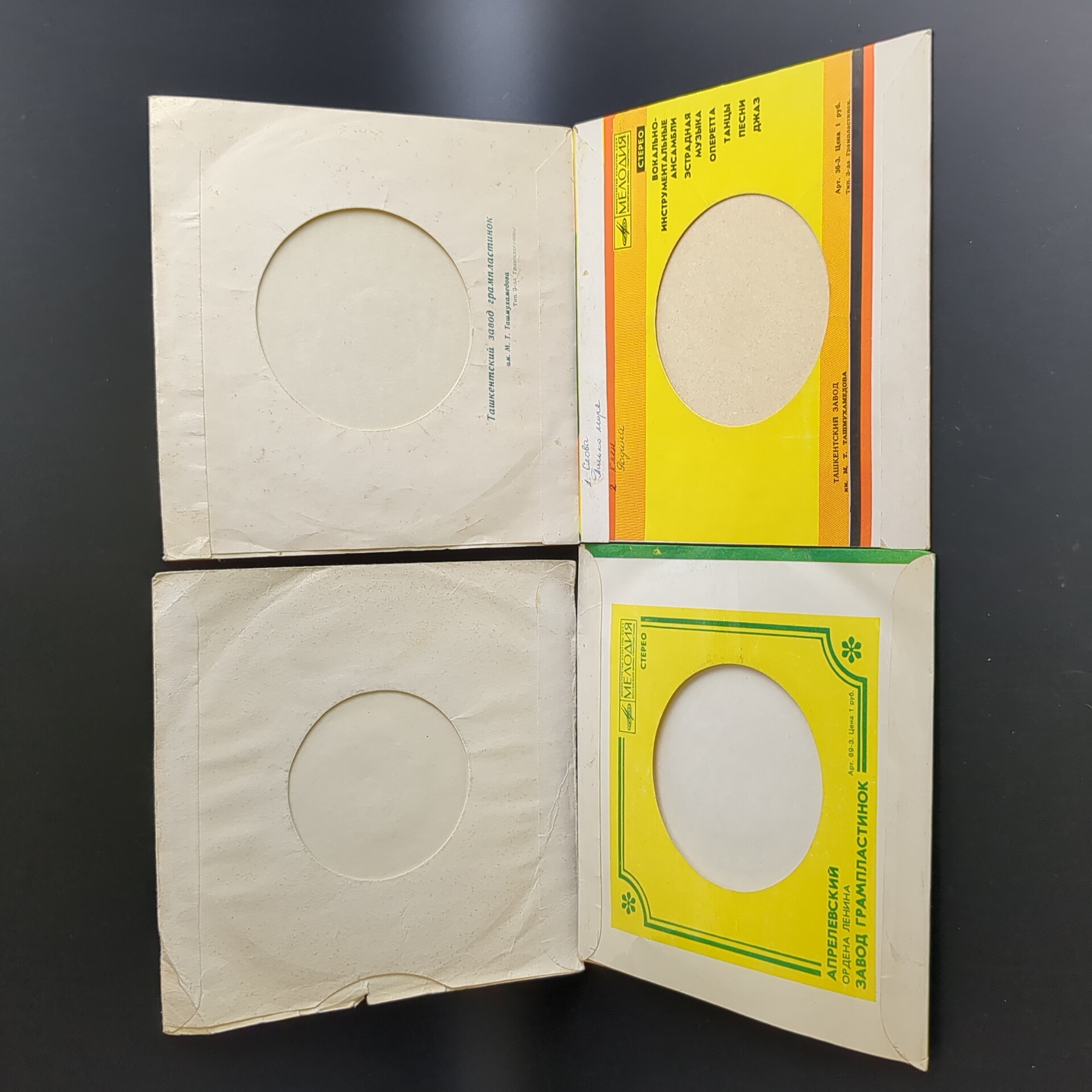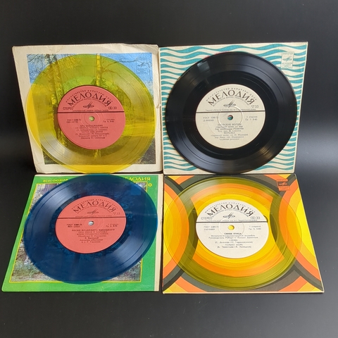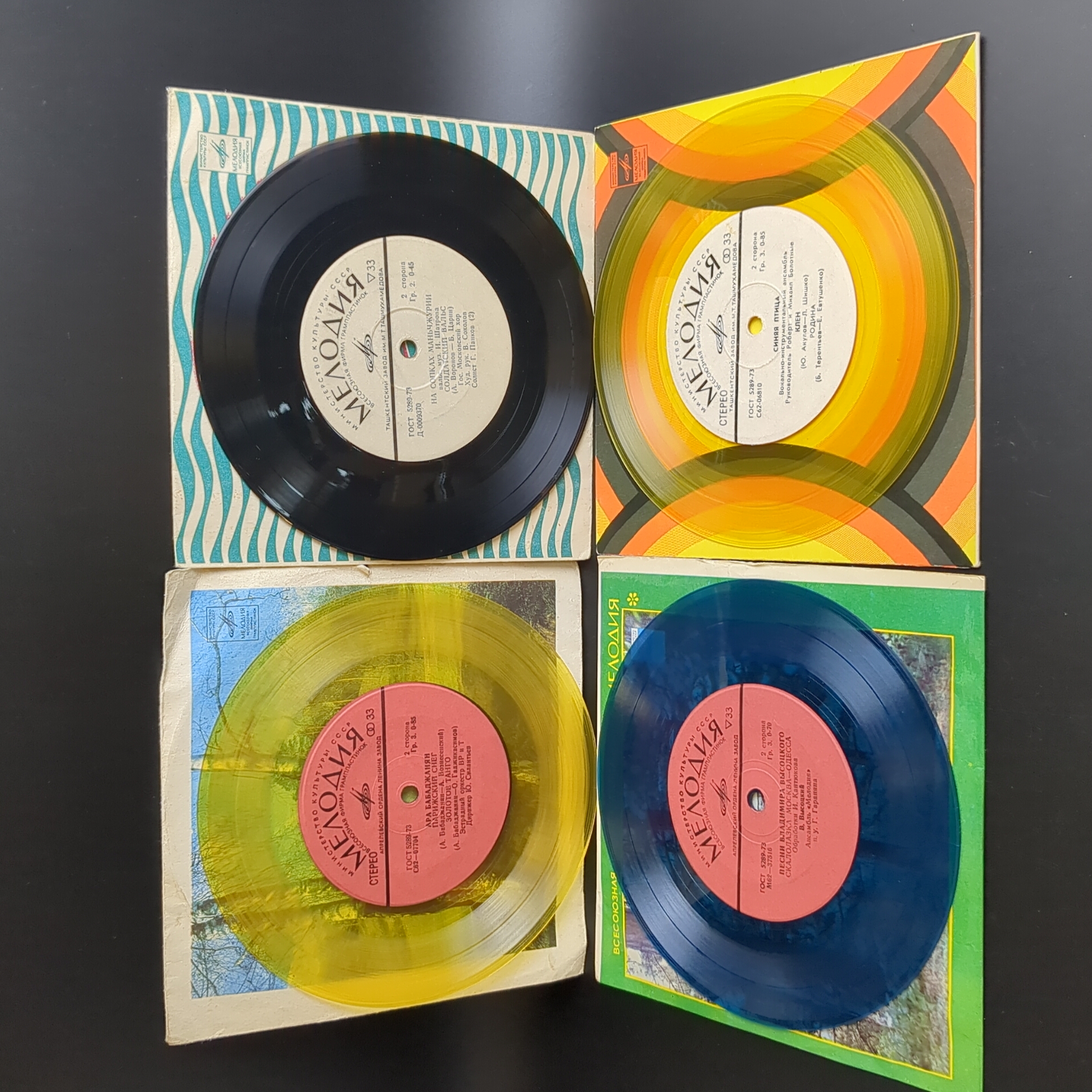 Набор из 4 цветных пластинок / цветные редкие коллекционные пластинки : ВИА Синяя птица - жёлтый винил / В. Высоцкий - синий винил / А. Бабаджанян - жёлтый винил / Старинные вальсы - чёрно-жёлтый винил. 4 Виниловые пластинки 7 дюймов миньоны. Мелодия СССР. Конверты VG / Диски EX
