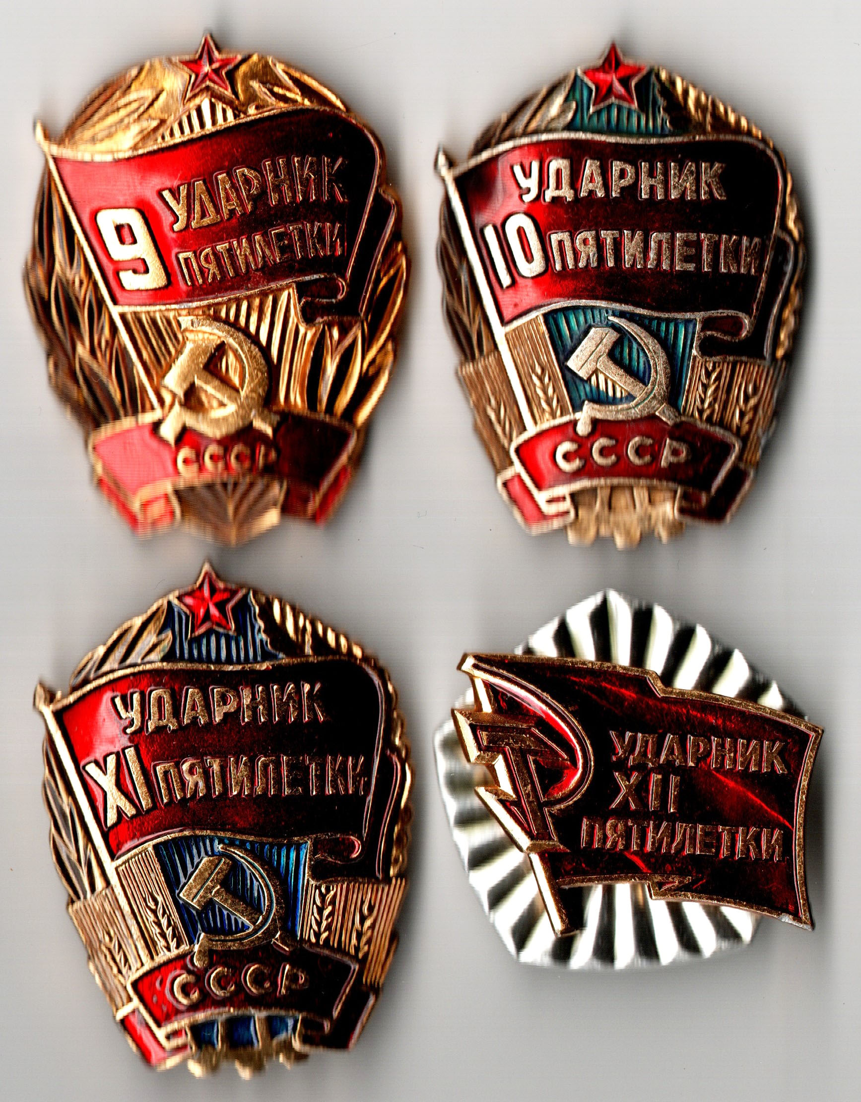 Набор из 4 знаков Ударник 9, 10, 11, 12 Пятилетки. Мытищинский завод опытных и сувенирных изделий, алюминий, эмаль, краска, СССР, 1981-1985 гг.