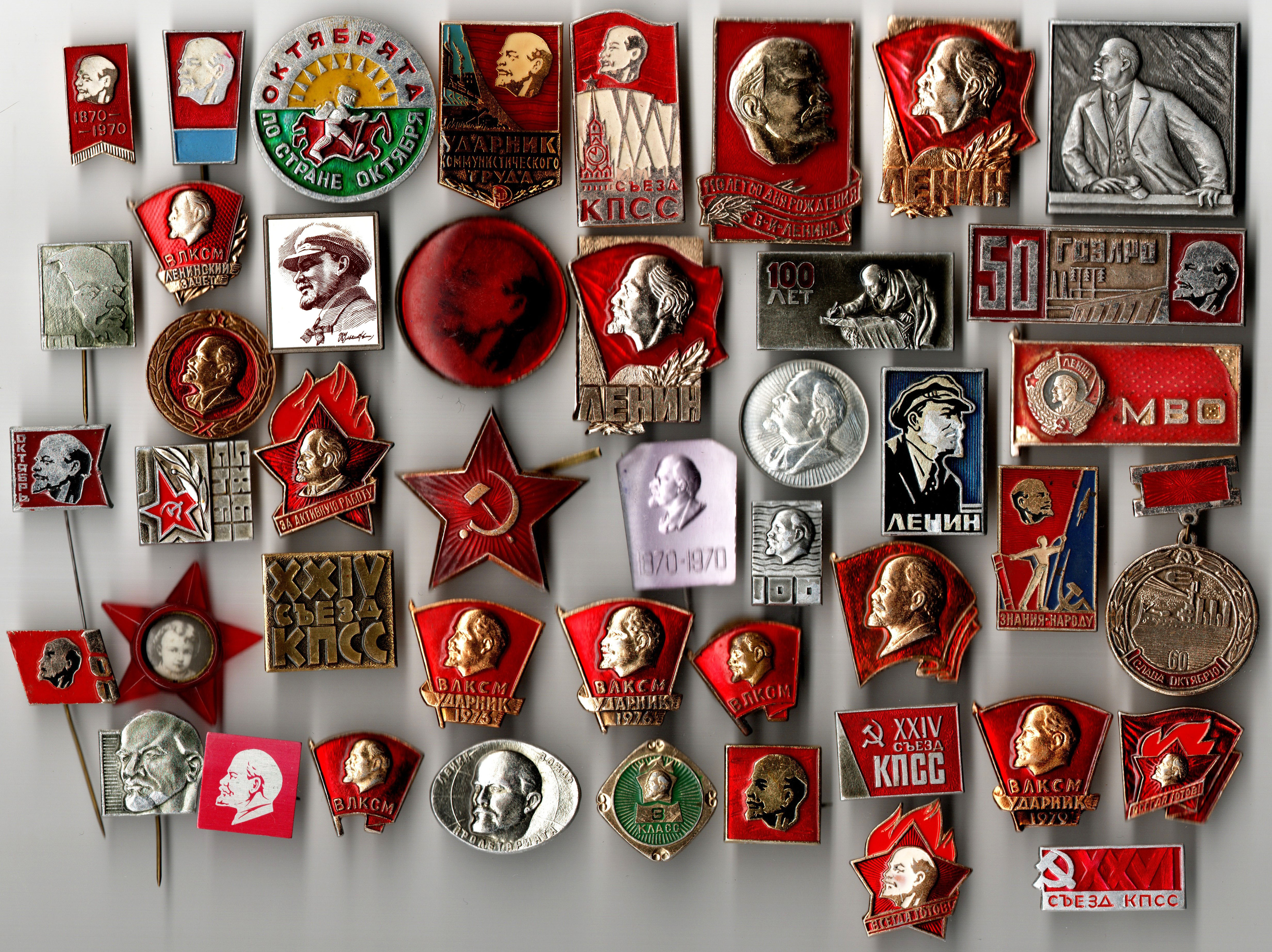 Набор из 45 значков СССР на тему Ленин, Октябрь, ВЛКСМ, Партсъезды КПСС без повторов
