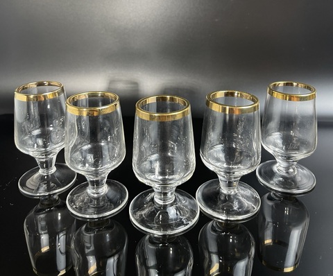 Набор из 5 изящных ликерных рюмок с позолоченным ободком , винтажные СССР 1970-1990 гг. Высота рюмки - 6 см, диаметр горлышка- 3 см.