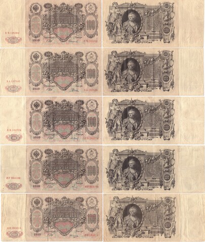 Набор из 5 кредитных билетов 100 рублей 1910 года. Управляющий Шипов. Набор разных кассиров.