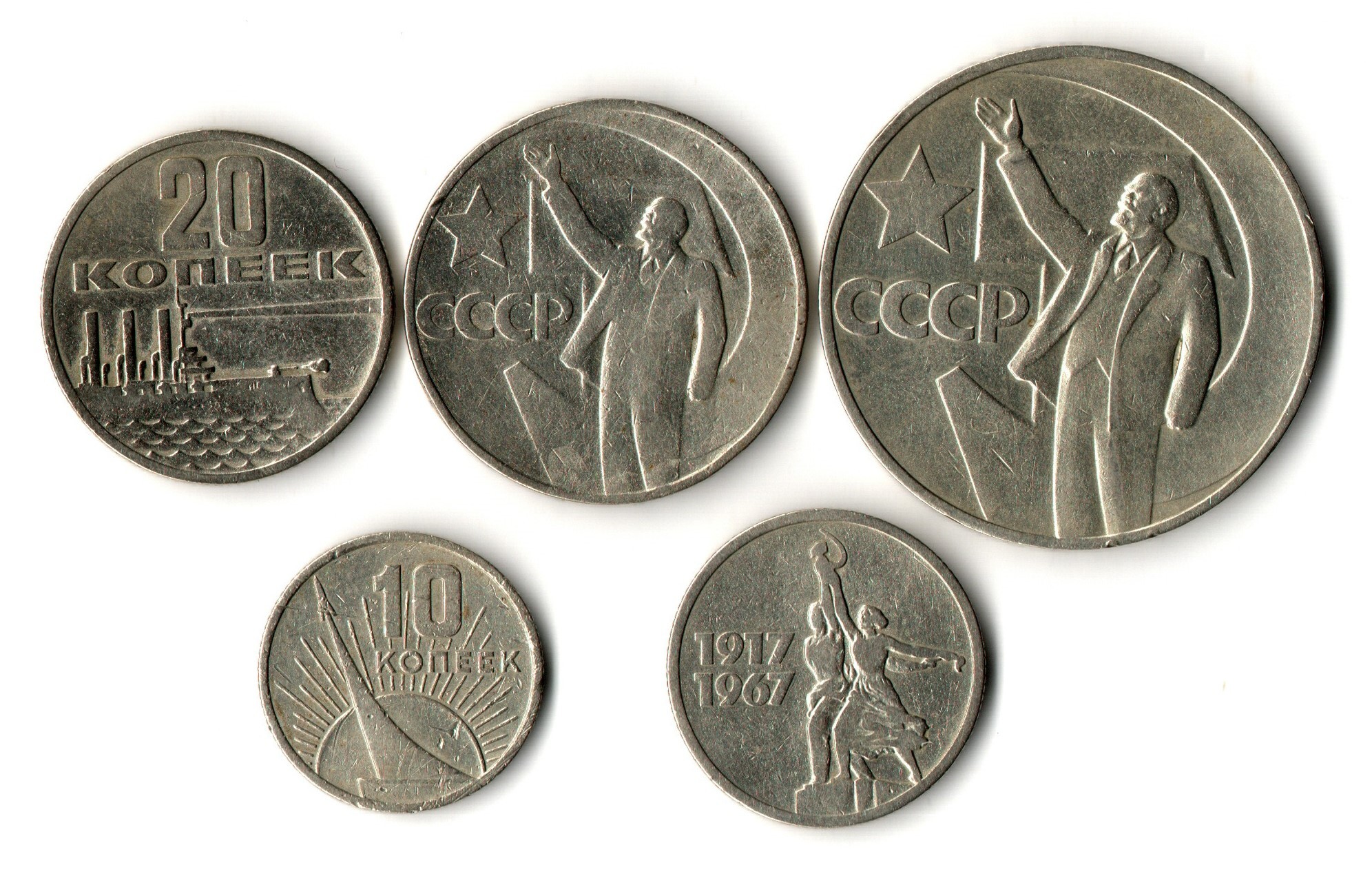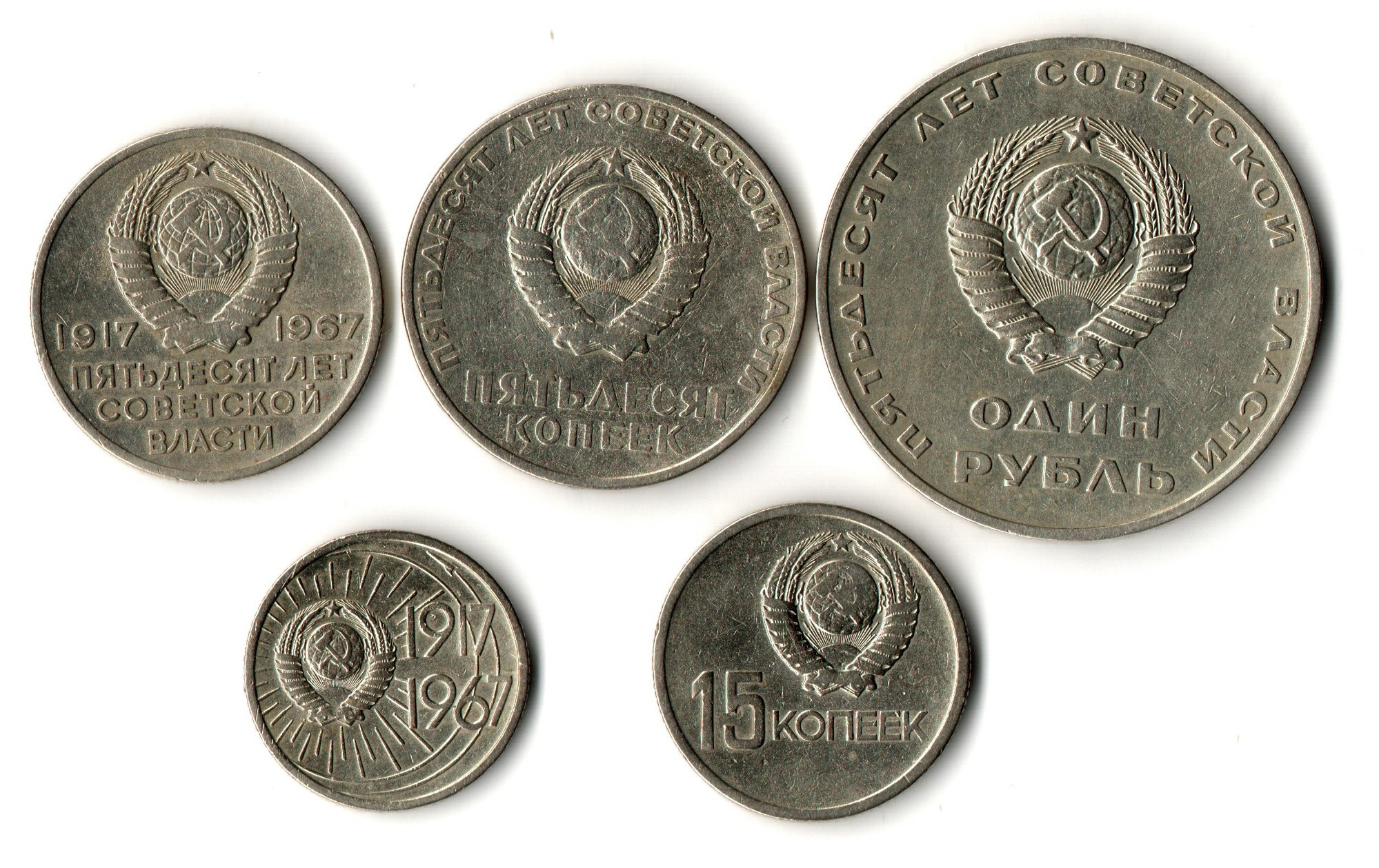 Набор из 5 монет серии 50 лет Советской Власти (10 коп, 15 коп, 20 коп, 50 коп, 1 рубль) - 1967 год