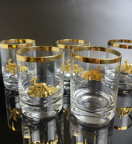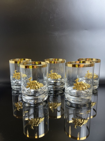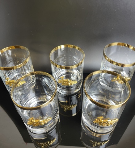 Набор из 5 стаканов стекло "Охота", олень с жёлудями, позолота винтаж. Высота - 9 см, диаметр верха - 6.8 см. Сервантное хранение, присутствуют незначительные следы использования, состояние на фото