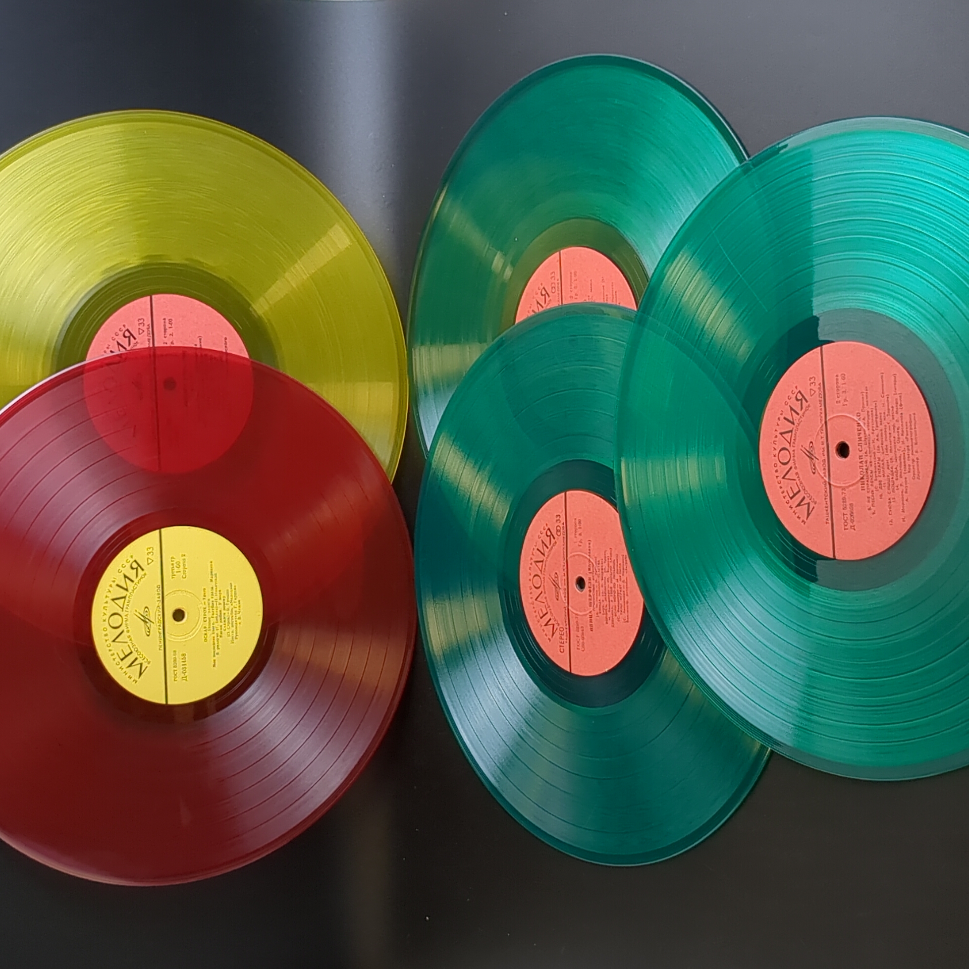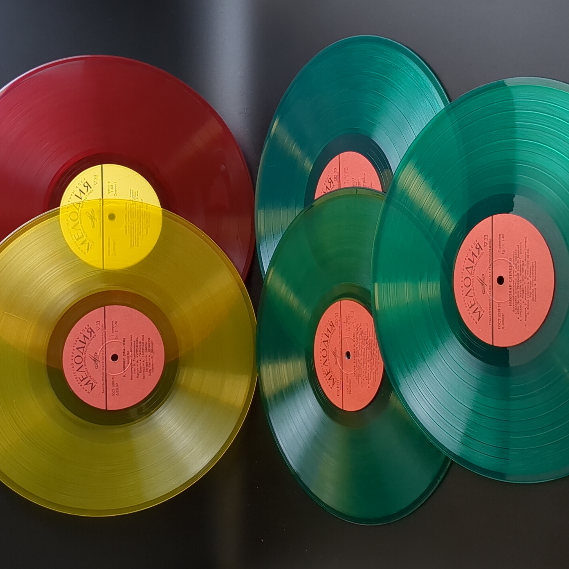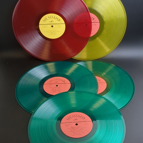 Набор из 5 цветных пластинок для декора. 5 Виниловых пластинок 12 дюймов 30 см / цветные редкие коллекционные пластинки. На пластинках присутствую царапины, продаются как для декора интерьера и для поделок. Состояние на фото. Жёлтый винил, красный винил, зеленый винил. Панно на стене из пластинок может стать классическим вариантом декора. Стильное оформление подвесными пластинками на разных уровнях пользуется популярностью в ресторанах и барах в стиле 60-х-70-х. Сделать настенные часы станет еще одним интересным решением, этим точно можно удивить друзей и гостей. А еще, пластинки можно сделать виде вешалок, стильного ретро-табурета, экстравагантной люстры или создать свою необычную и неповторимую композицию для декора.