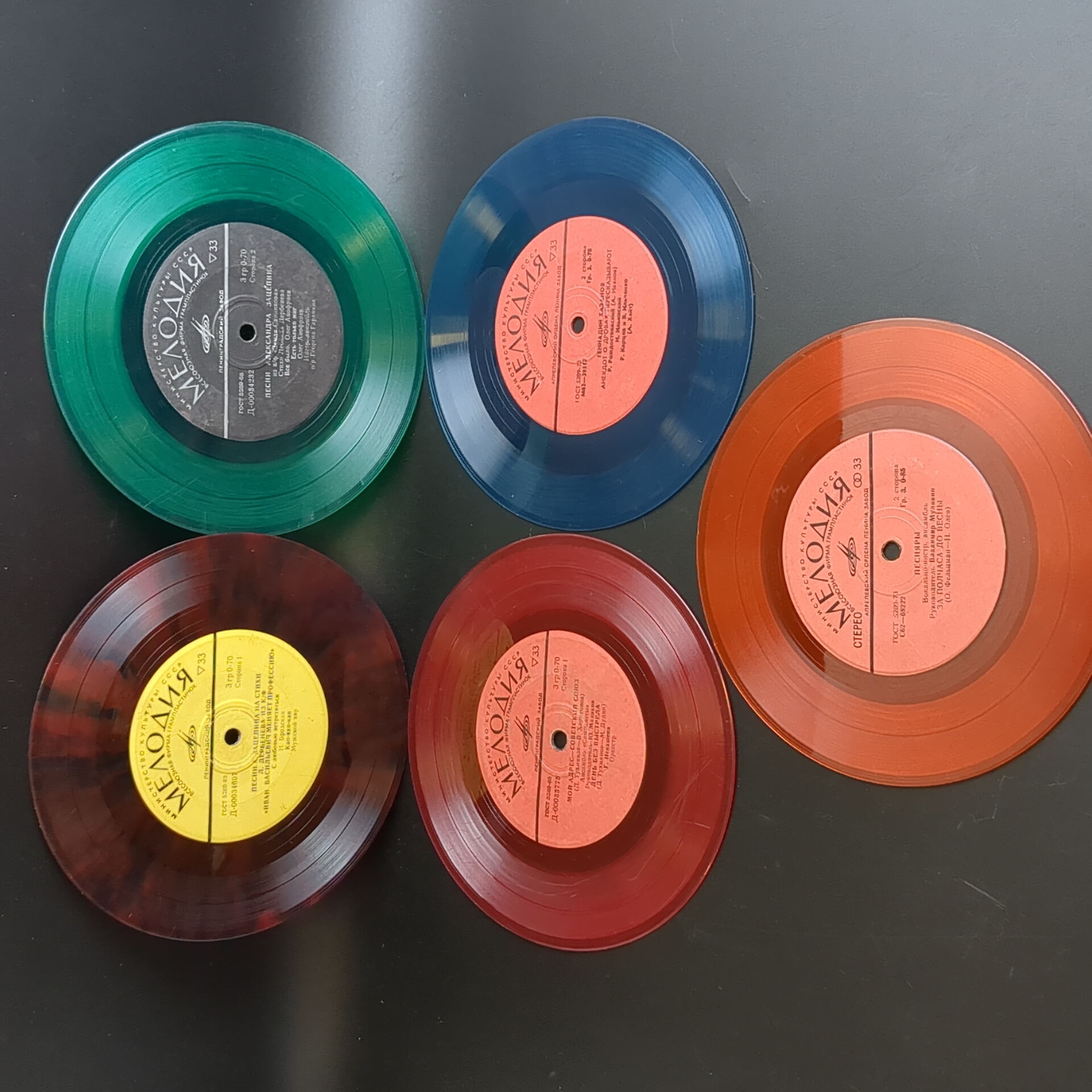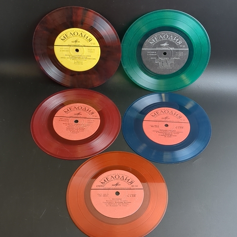 Набор из 5 цветных пластинок для декора. 5 Виниловых пластинок 7 дюймов миньоны / цветные редкие коллекционные пластинки. На пластинках присутствую царапины, продаются как для декора интерьера и для поделок. Состояние на фото. Красный винил, зеленый винил, синий винил. Панно на стене из пластинок может стать классическим вариантом декора. Стильное оформление подвесными пластинками на разных уровнях пользуется популярностью в ресторанах и барах в стиле 60-х-70-х. Сделать настенные часы станет еще одним интересным решением, этим точно можно удивить друзей и гостей. А еще, пластинки можно сделать виде вешалок, стильного ретро-табурета, экстравагантной люстры или создать свою необычную и неповторимую композицию для декора.